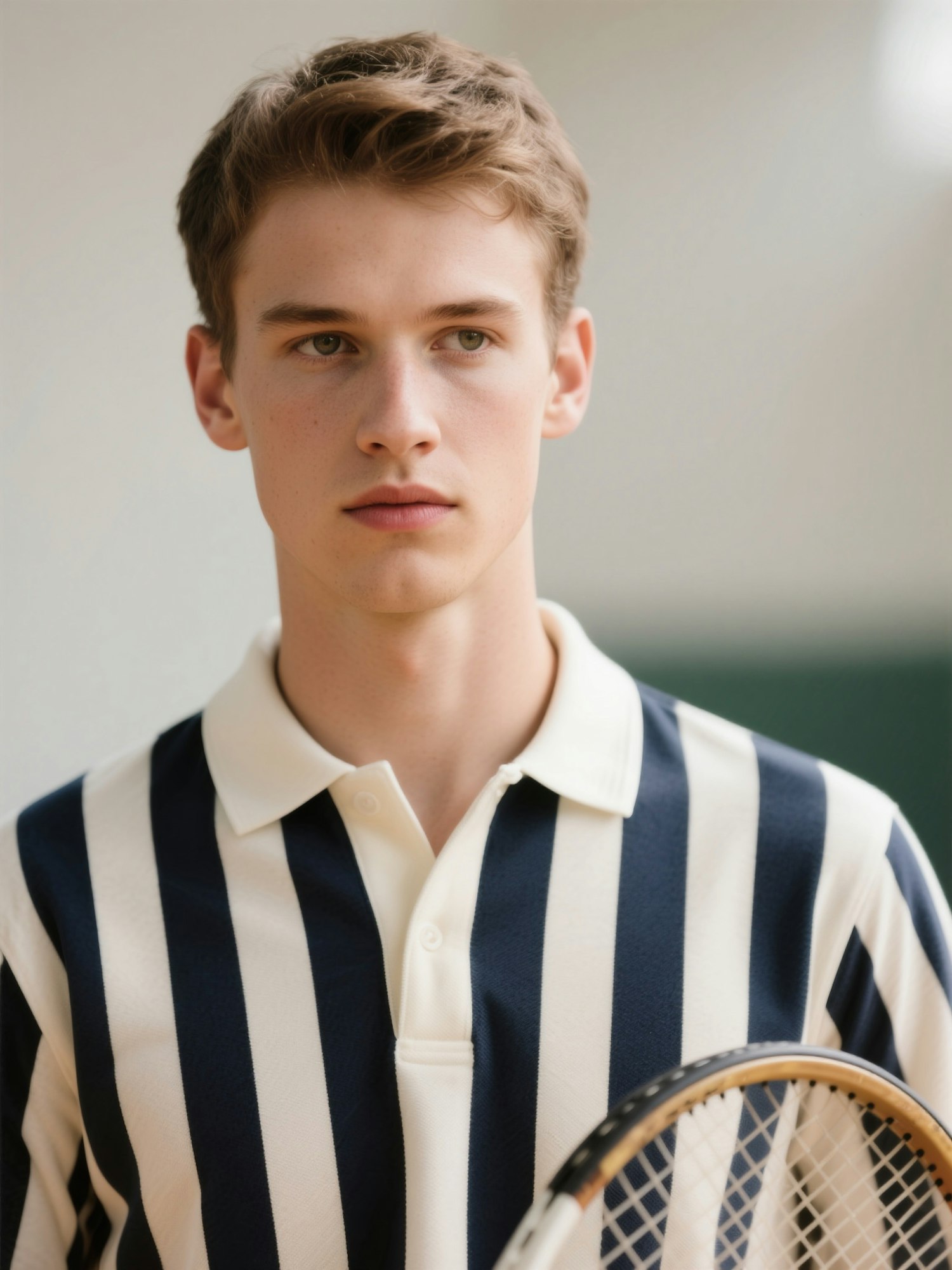 Young male tennis player in a retro-sporty shirt with high-end fashion editorial, focused expression, no racket, the mood is retro-sporty and clean --sref 3721090848 --sref 2560033873