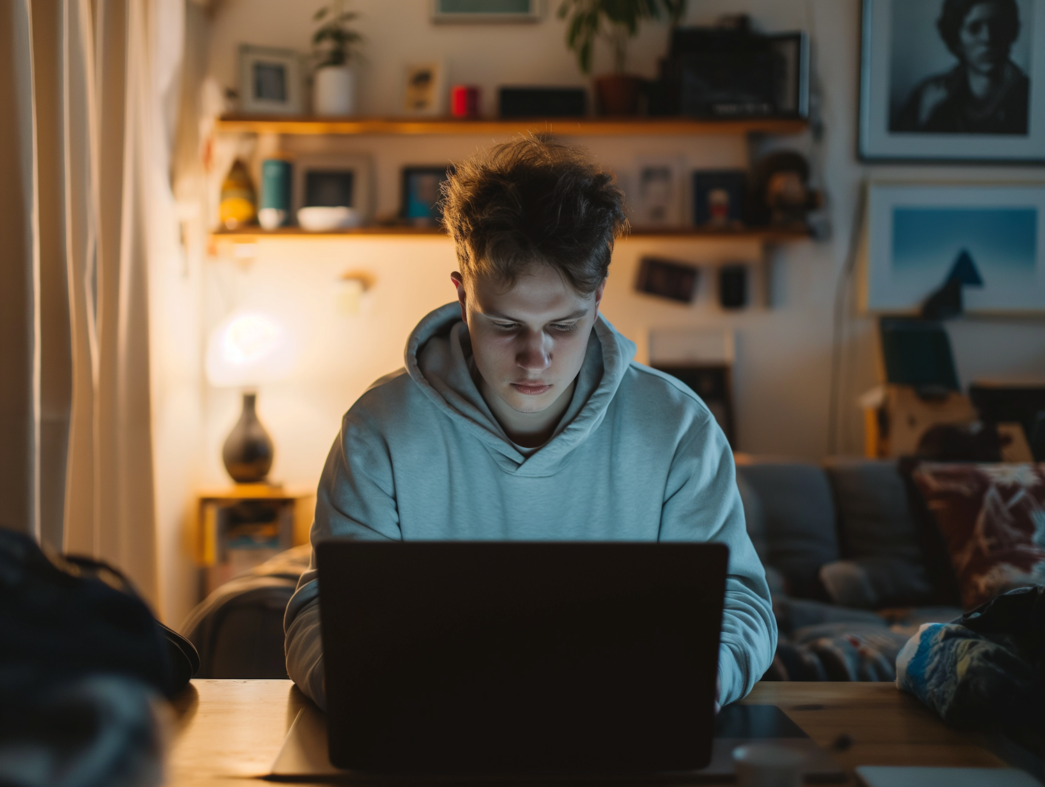Young man in a hoodie focused on a laptop in a cozy, dimly lit room with warm ambient lighting.