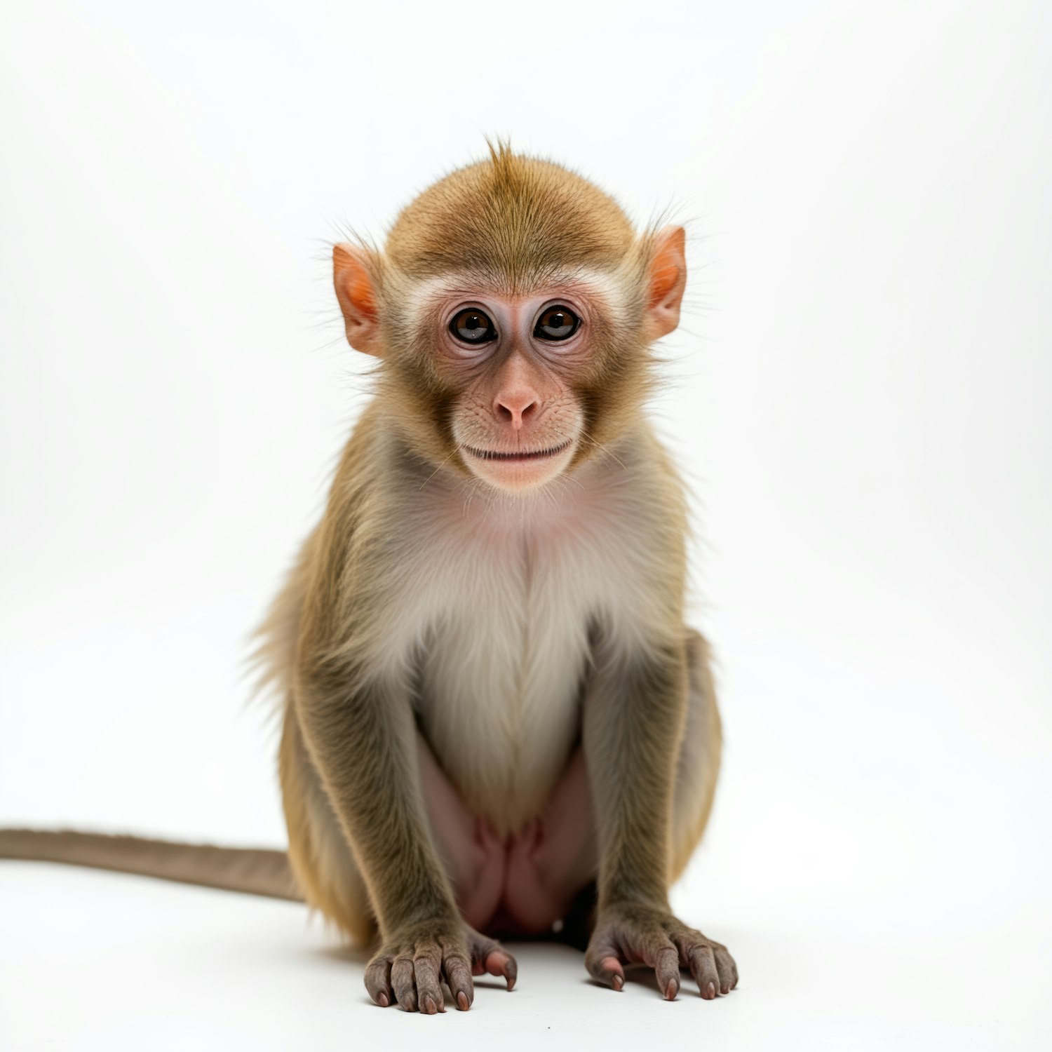 Adorable young monkey with expressive eyes and light brown fur sitting against a white background, showcasing its charming features.