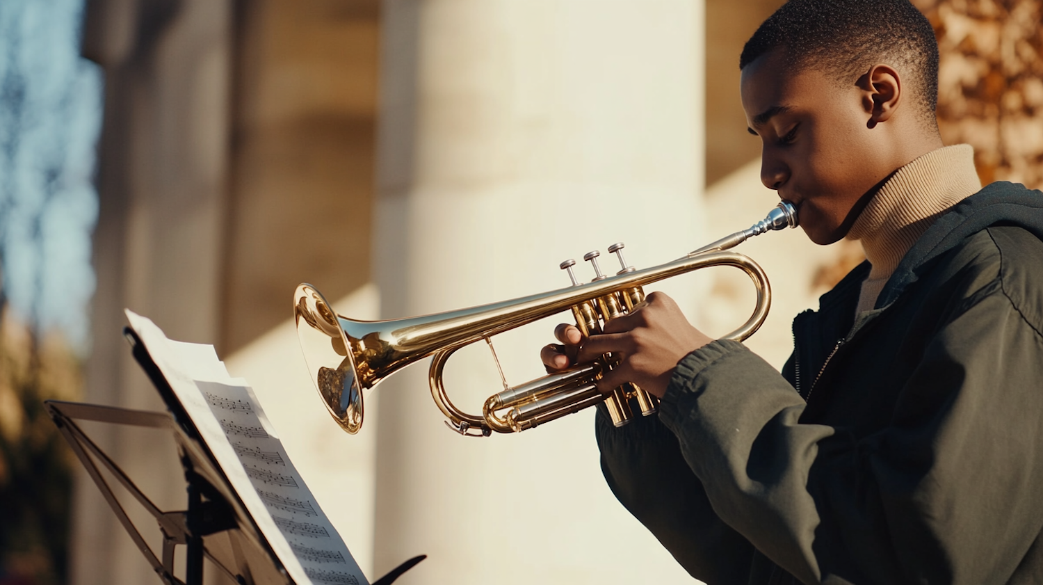 Young musician plays trumpet outdoors, focused on sheet music. Sunlight highlights the brass instrument and his concentrated expression.