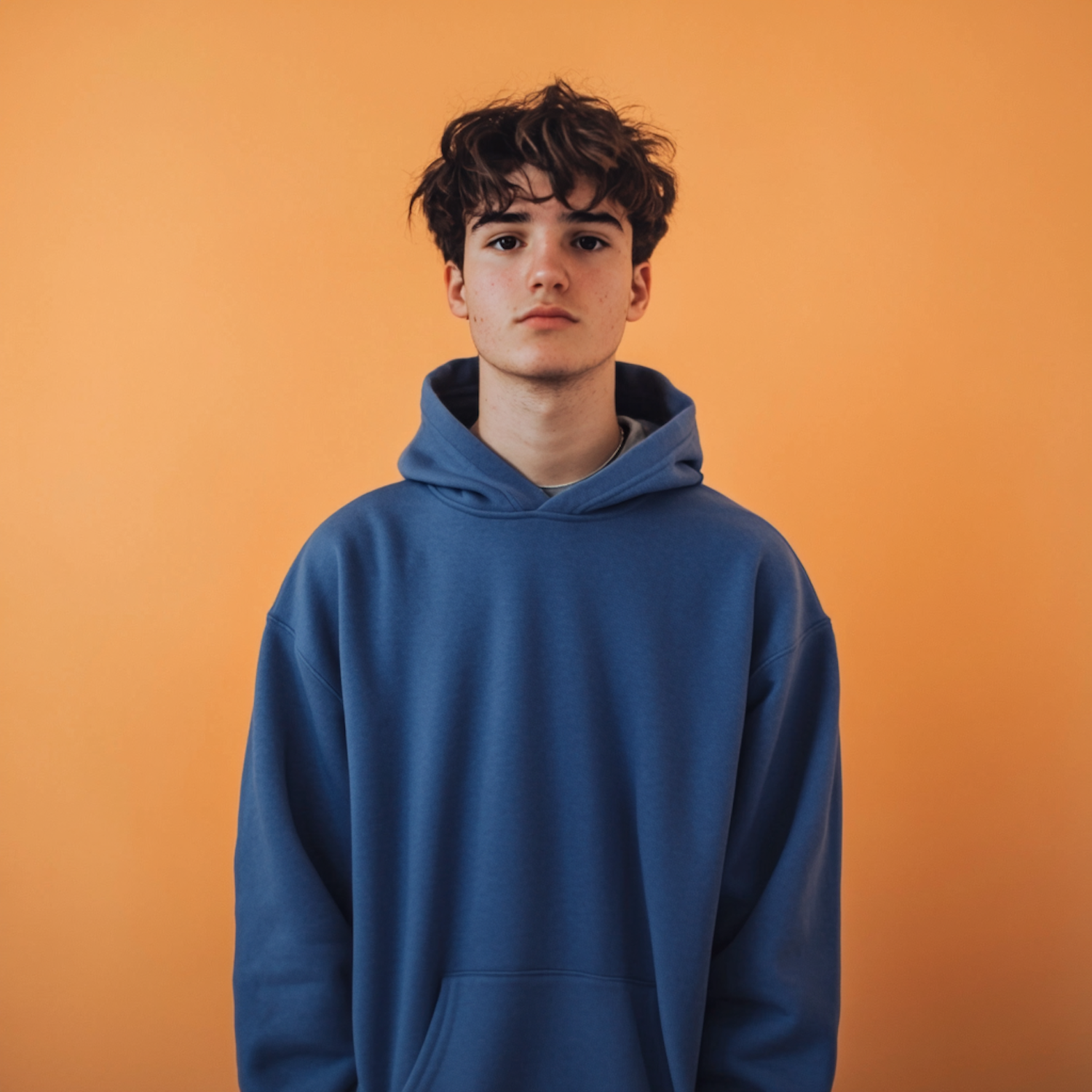 Young man in a blue hoodie against an orange background, with curly brown hair and a neutral expression.