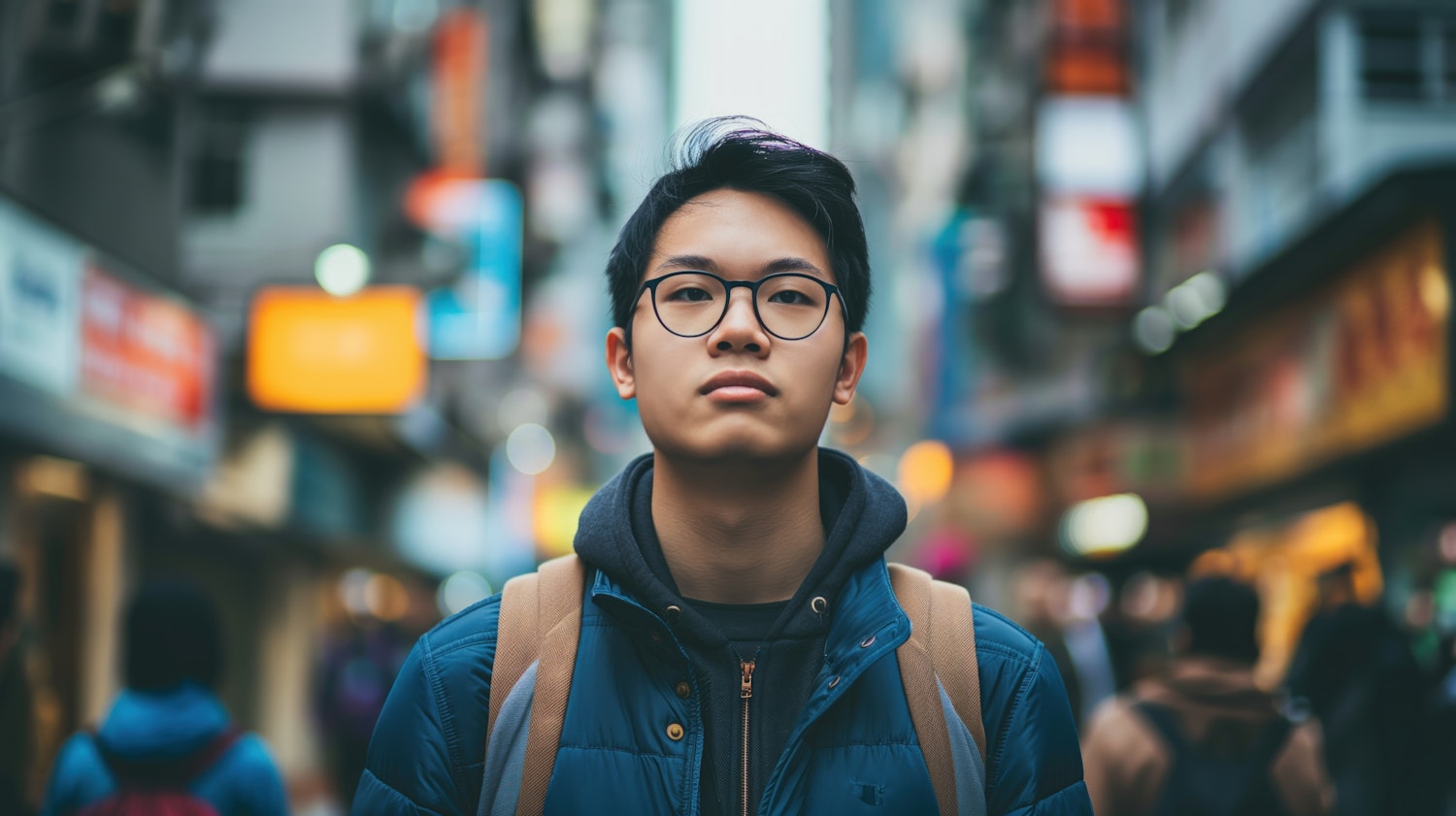 Young Asian man with glasses in a bustling city street, wearing a blue jacket and backpack. Vibrant urban background.
