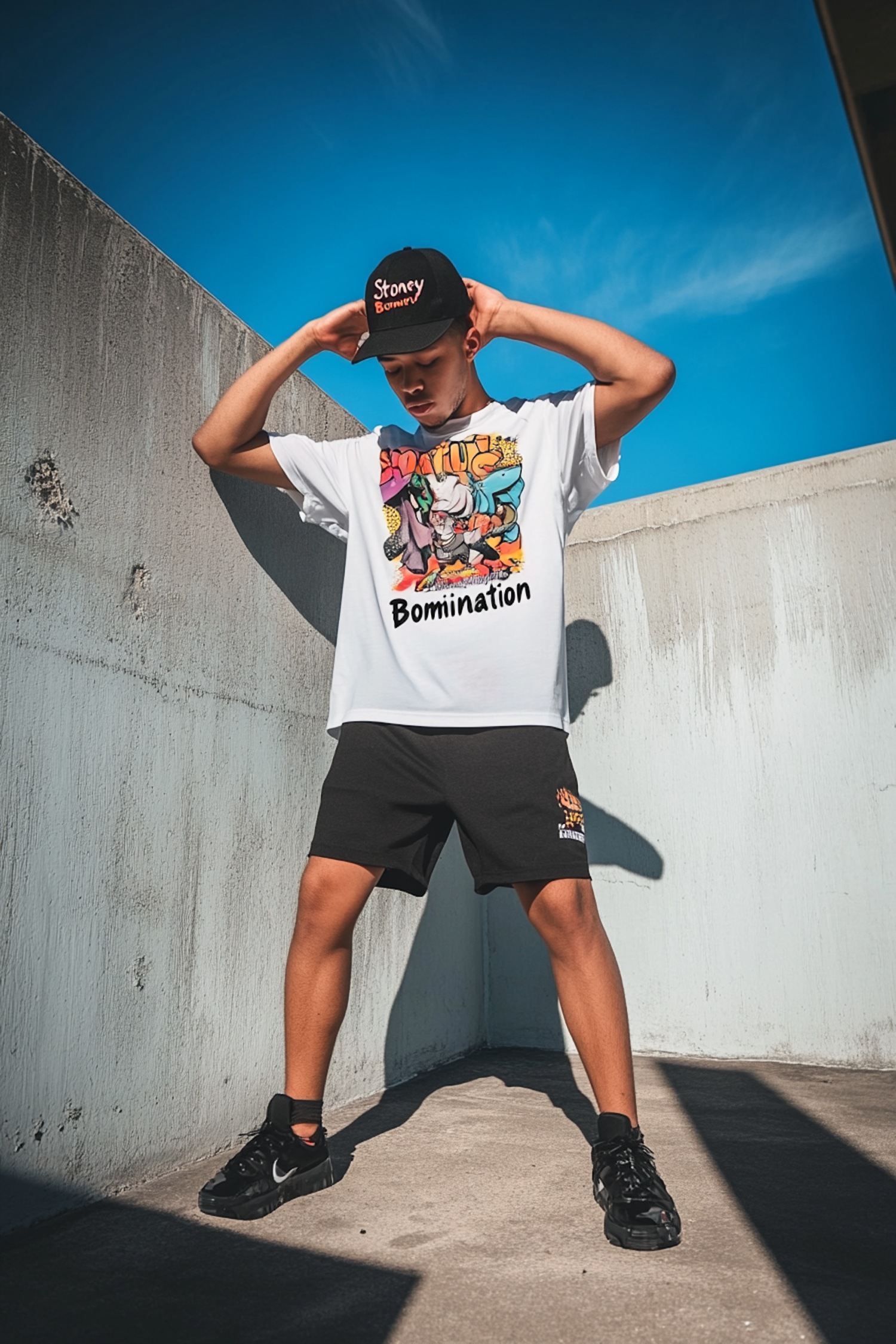 Young man in urban setting wearing a graphic t-shirt, black shorts, and a cap. Vibrant colors contrast with concrete background.