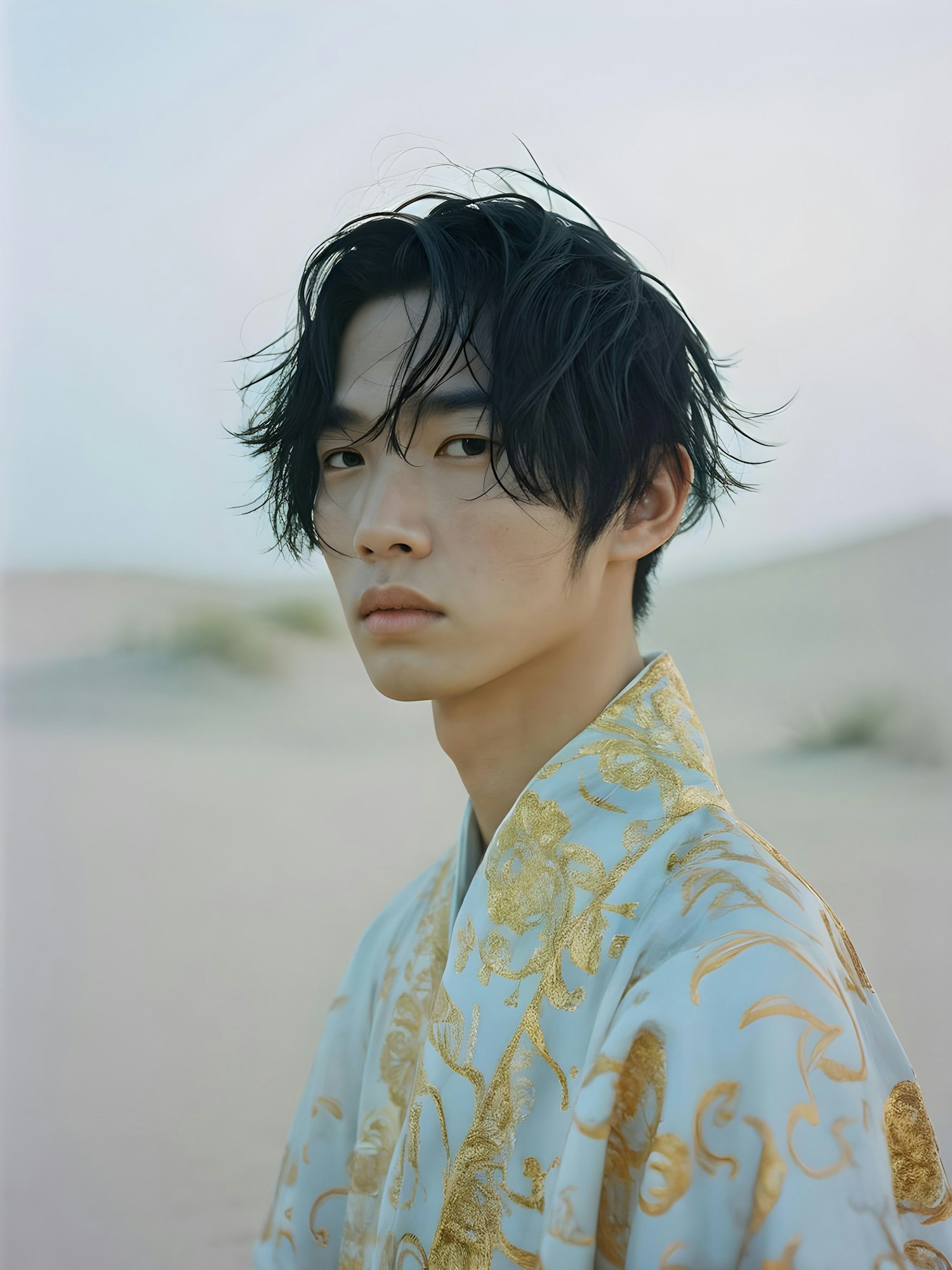 Asian male in traditional attire with gold embroidery, standing in a serene desert landscape, exuding elegance and contemplation.