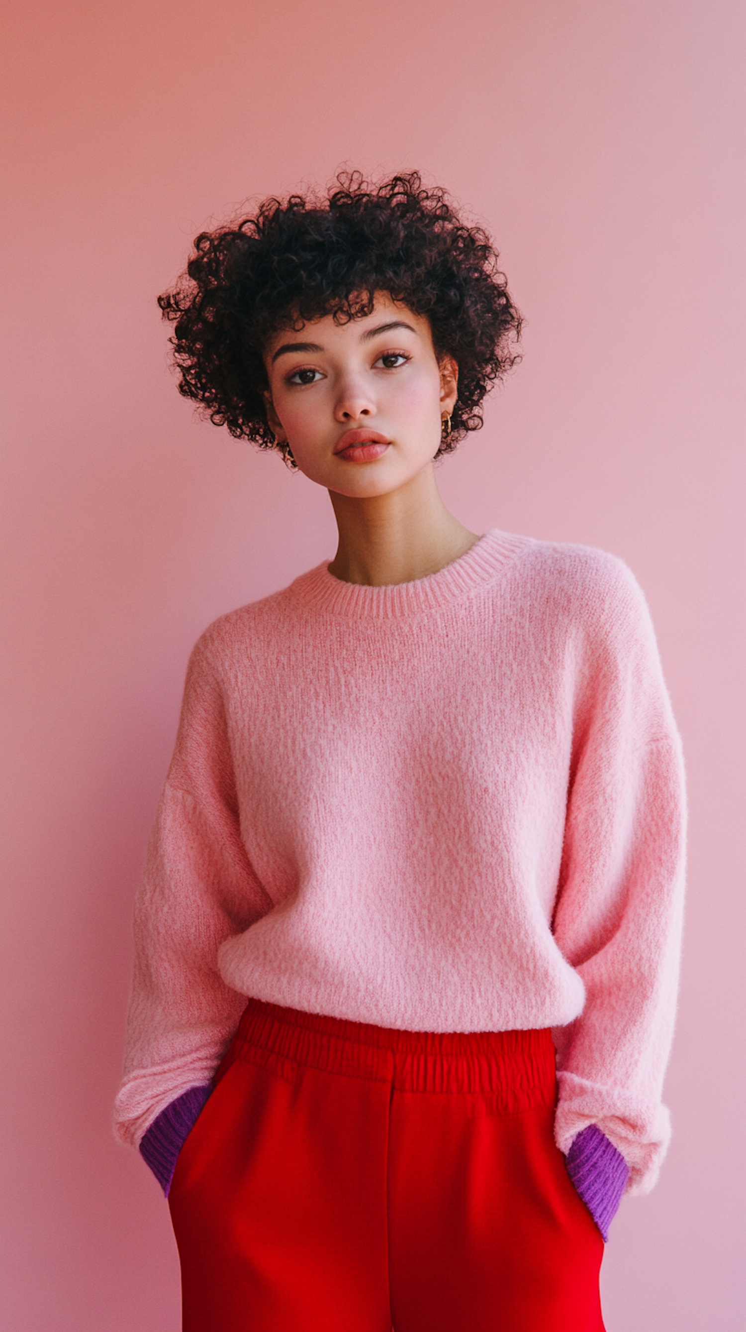 Young woman in pink sweater and red pants against a pink background, showcasing a vibrant and stylish fashion look.