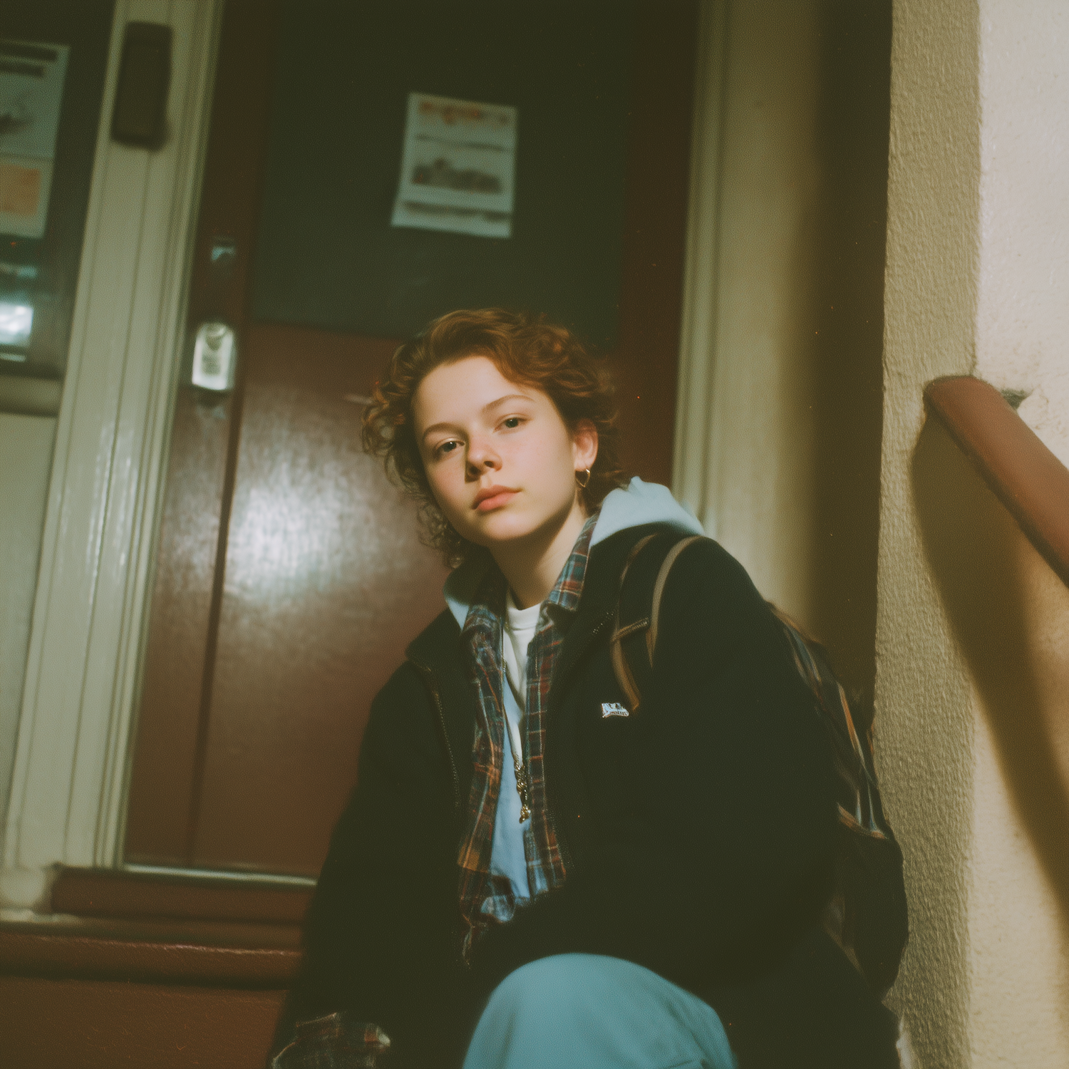 Casual portrait of a young person with short auburn hair, wearing a layered outfit and sitting on stairs near a red door.