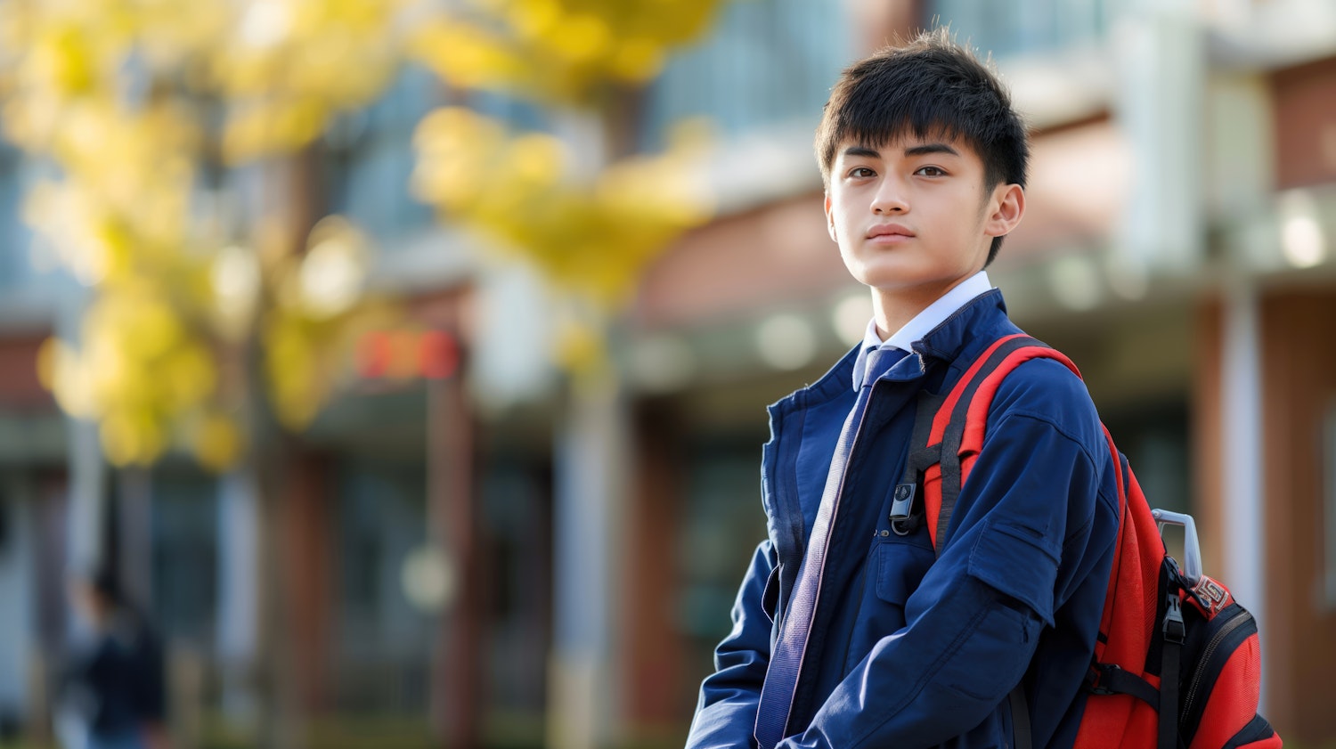 Young Asian boy with navy jacket and red backpack, standing outdoors on a sunny autumn day. Face blurred for privacy.