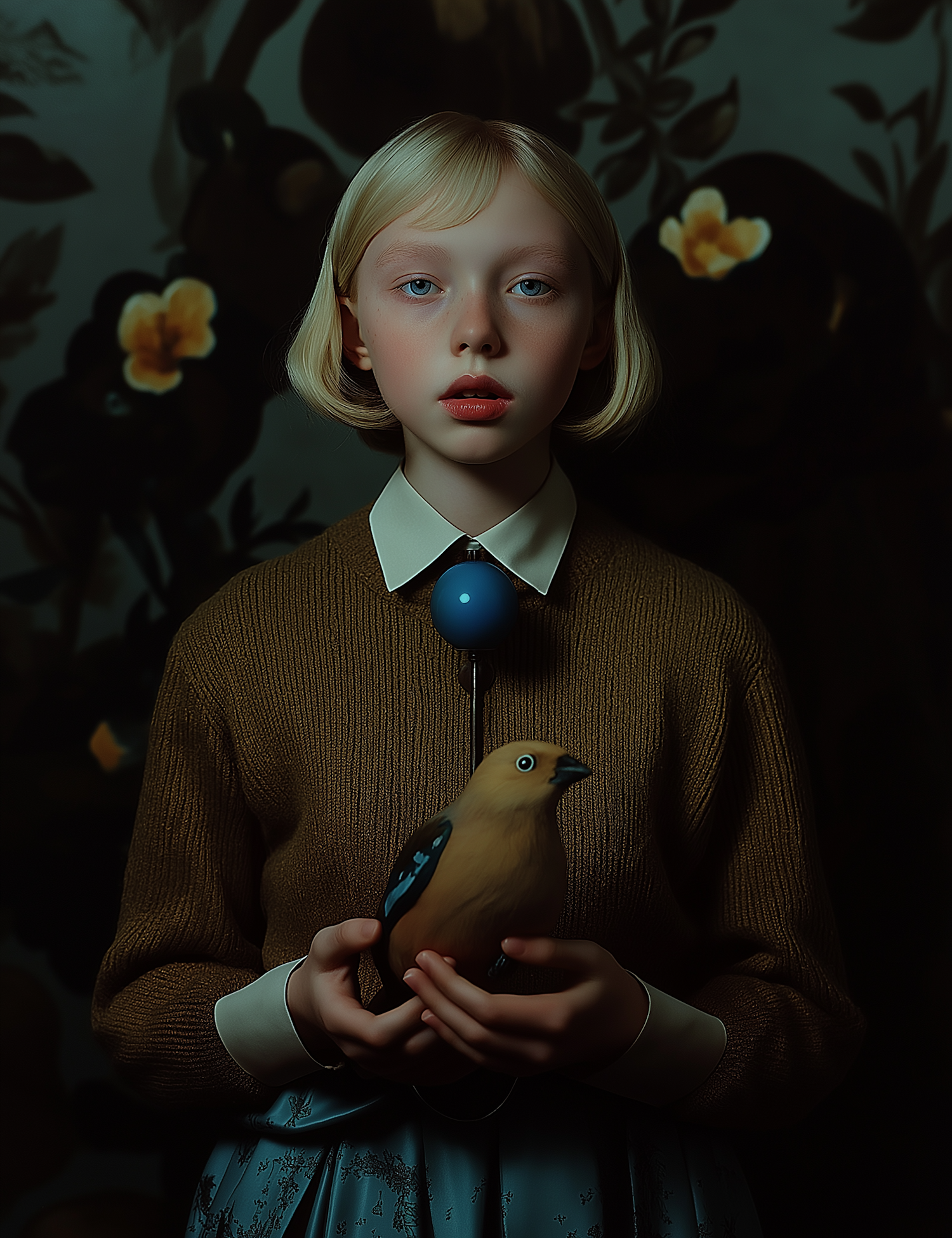 A young girl with blonde hair holds a bird, set against a dark floral background. Her calm expression and unique attire add intrigue.