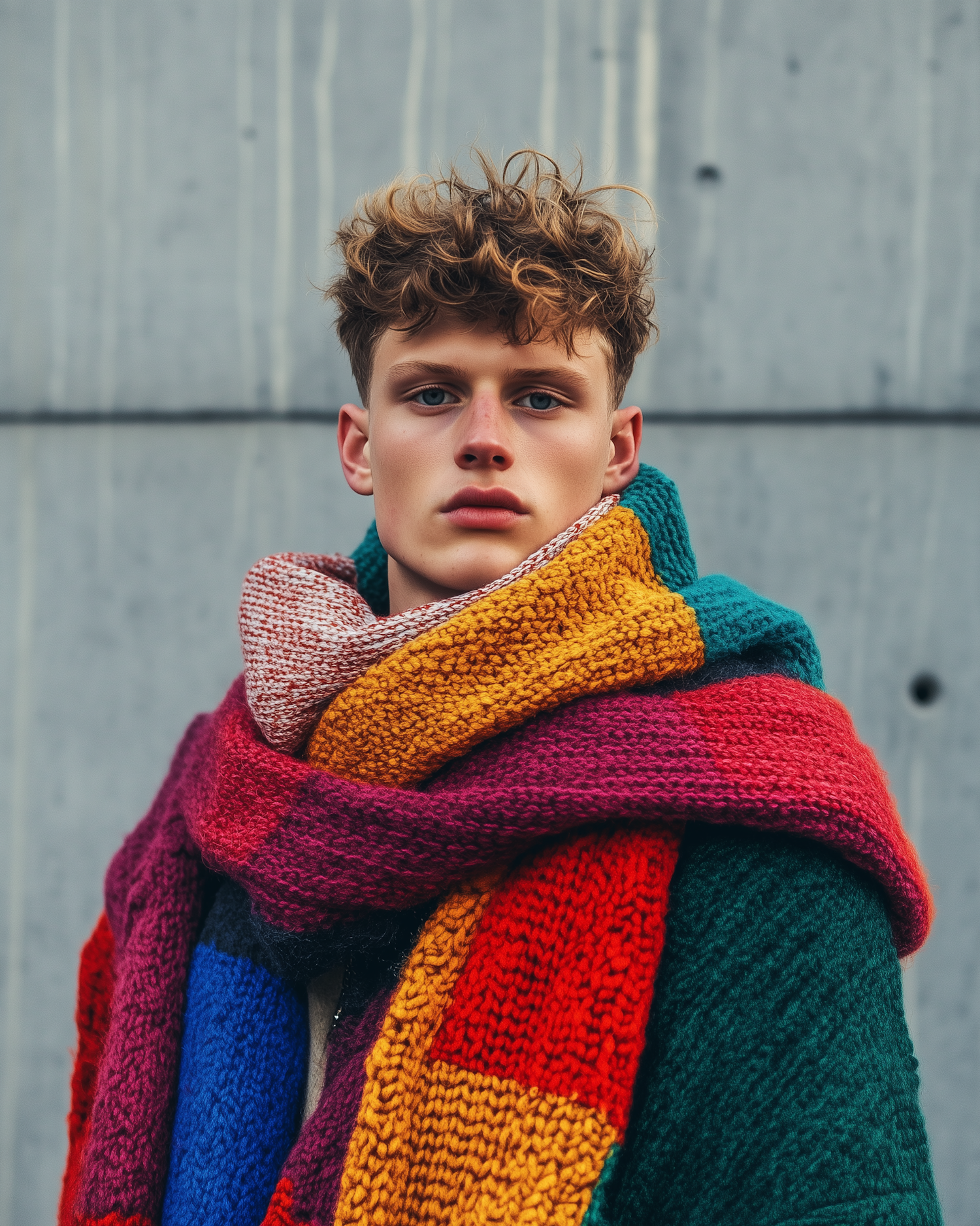 Young man with curly hair in a colorful knitted scarf and green coat against a concrete wall, showcasing vibrant winter fashion.
