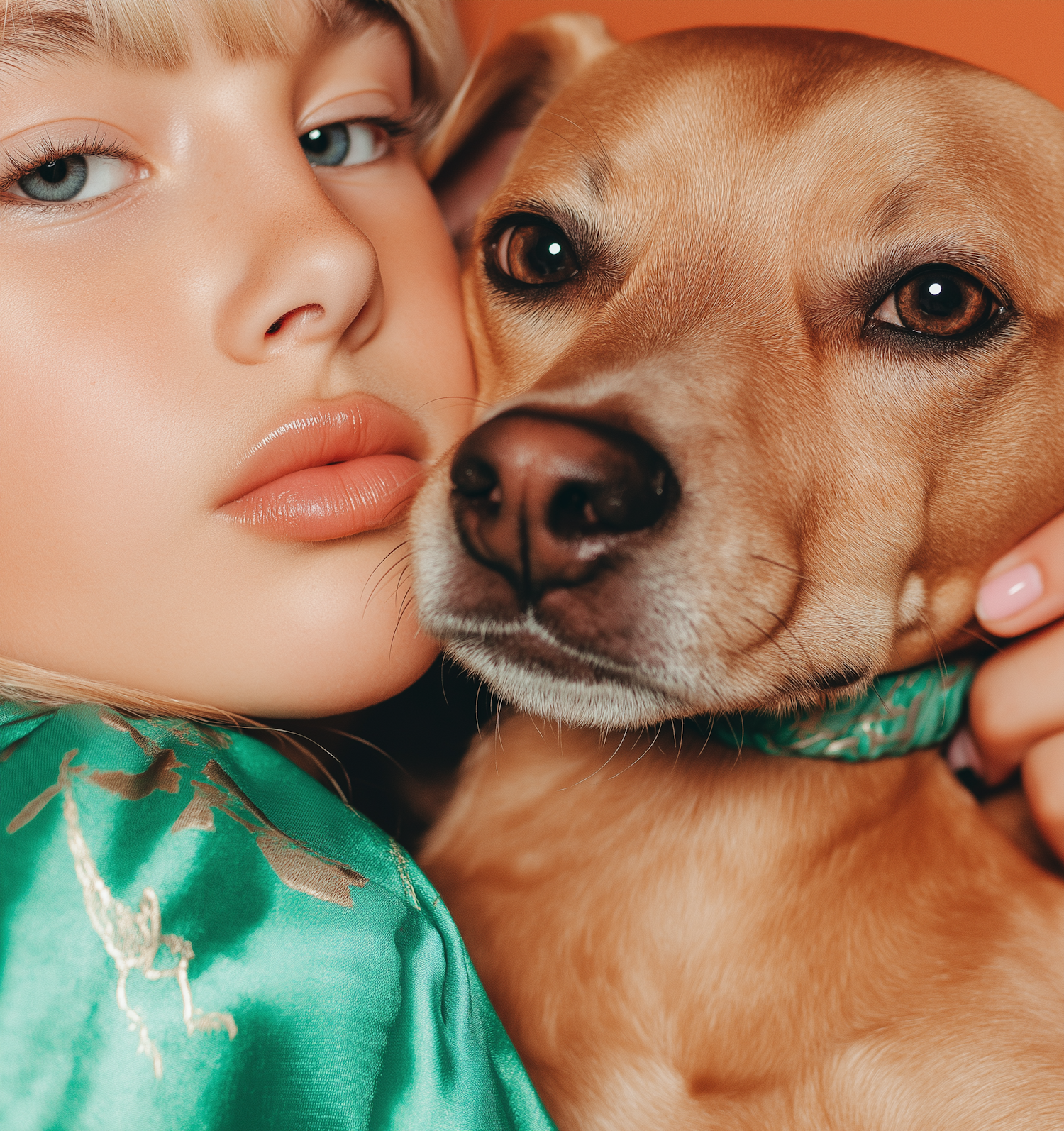 Close-up of a young woman with blonde hair and a light brown dog, both with calm expressions, against a warm orange background.