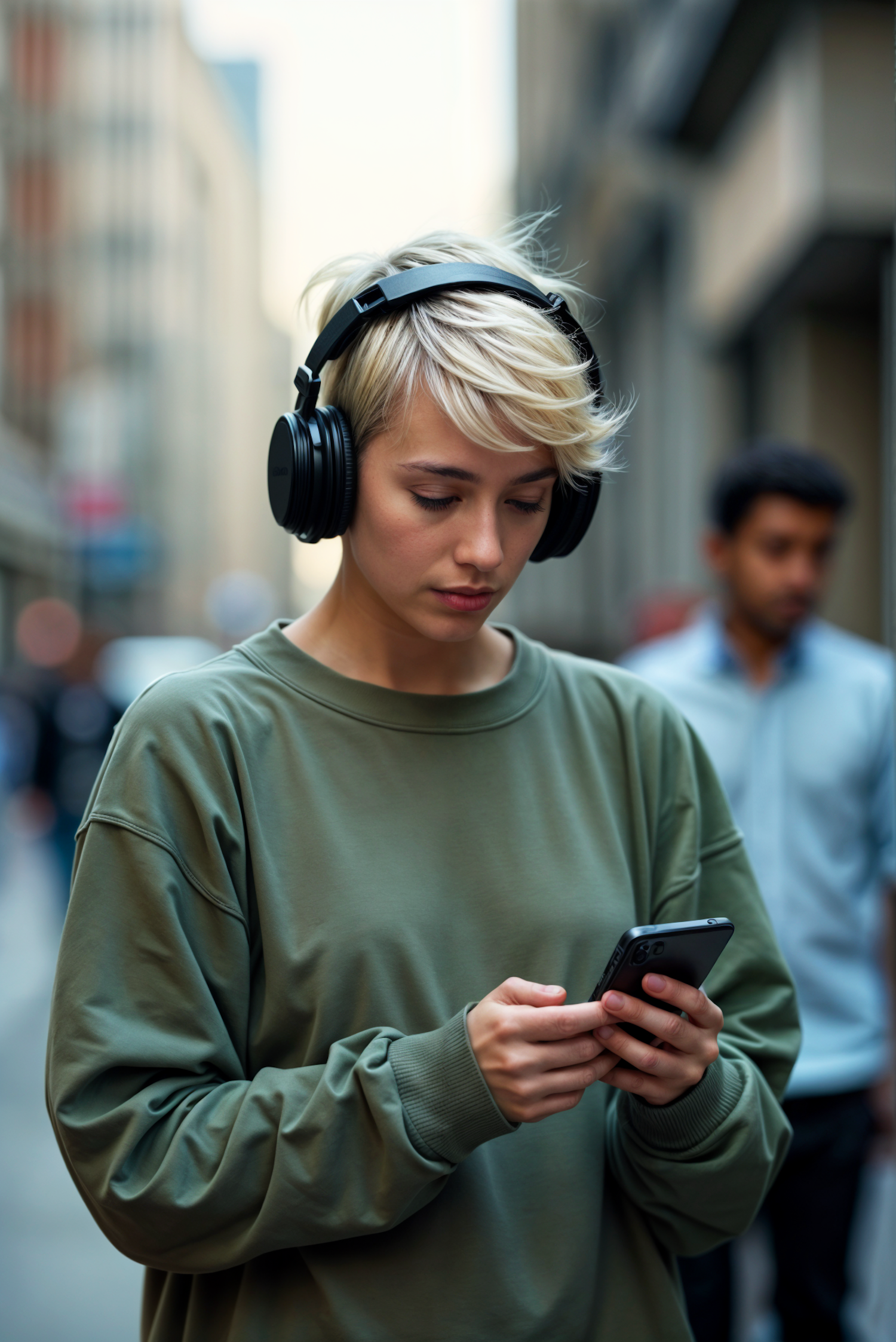 Young woman with headphones engrossed in her phone on a city street, wearing a green sweatshirt. Urban lifestyle captured.