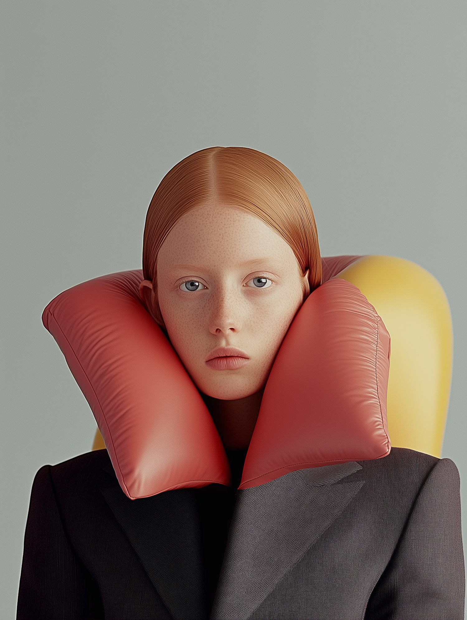Young woman with red hair and a red neck pillow, wearing a black blazer against a muted gray background.