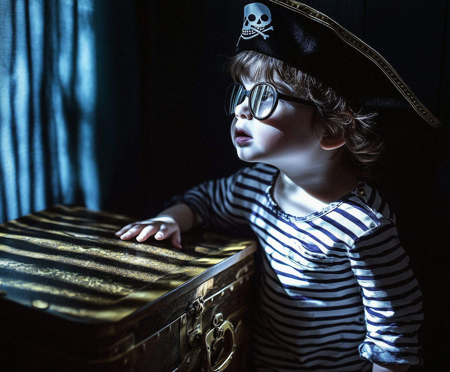 Child in pirate costume with hat and sunglasses, gazing at a treasure chest in dramatic lighting. Whimsical and adventurous scene.