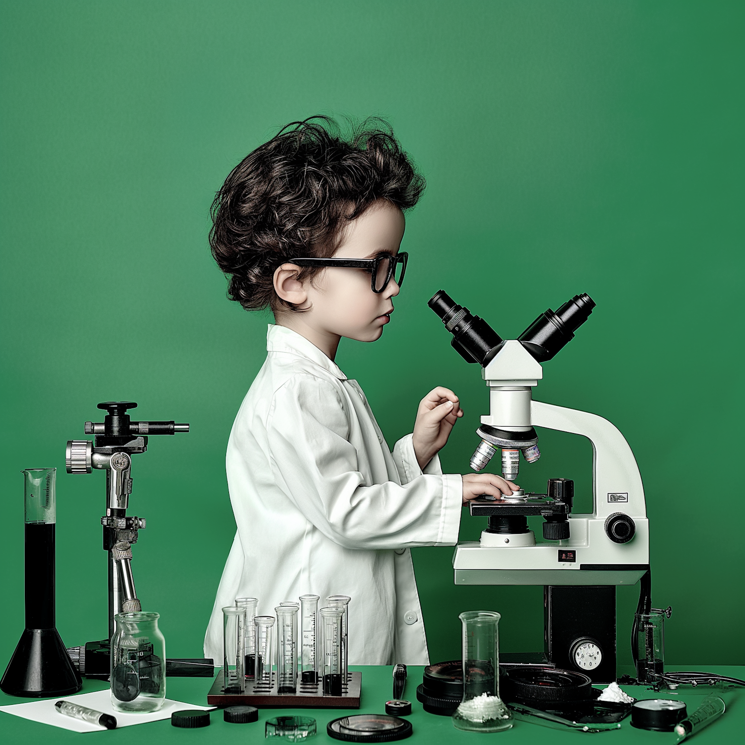A young child in a lab coat examines a microscope, surrounded by scientific equipment, against a vibrant green background.