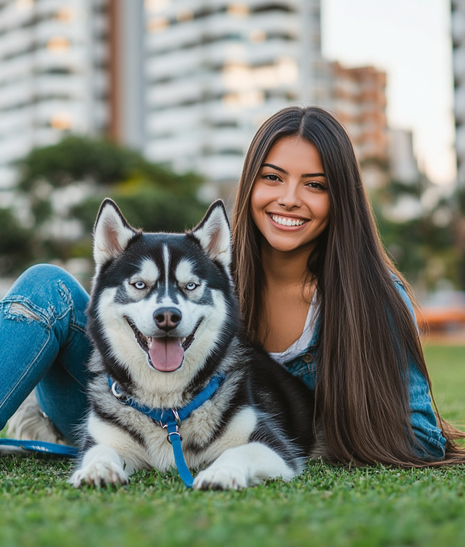 Smiling woman with long dark hair and a Siberian Husky in a park, surrounded by urban buildings and greenery.