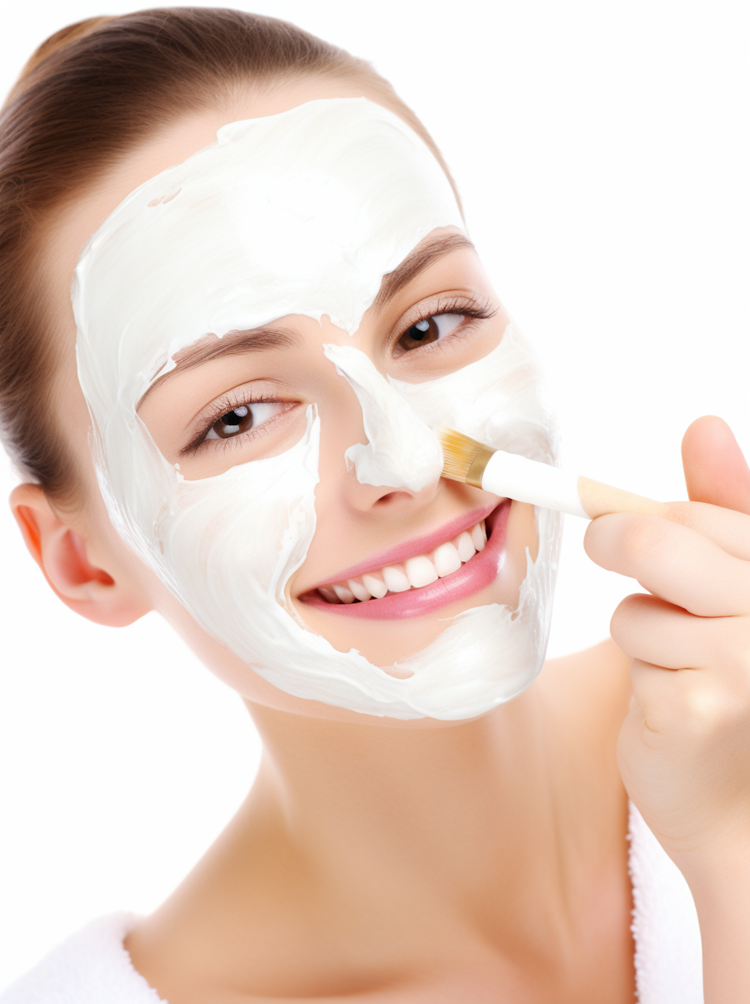 Smiling woman applying a white facial mask with a brush, showcasing a skincare routine in a bright setting.
