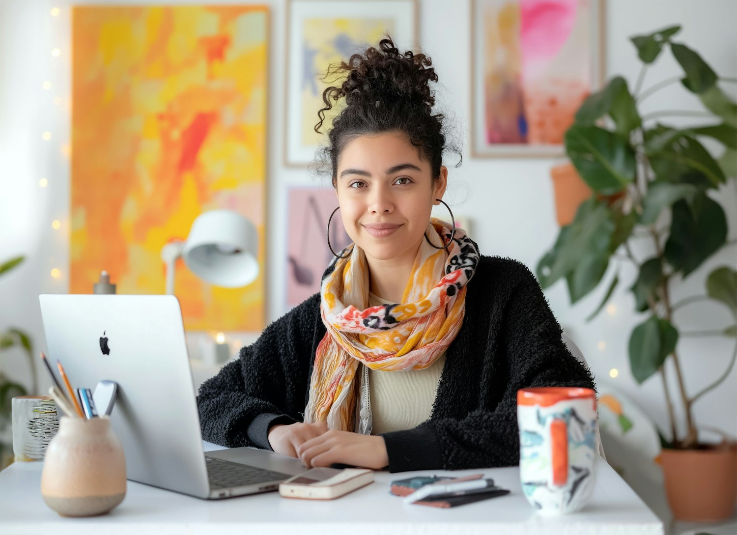 Young woman with curly hair and colorful scarf working at a desk with a laptop, surrounded by art and plants.