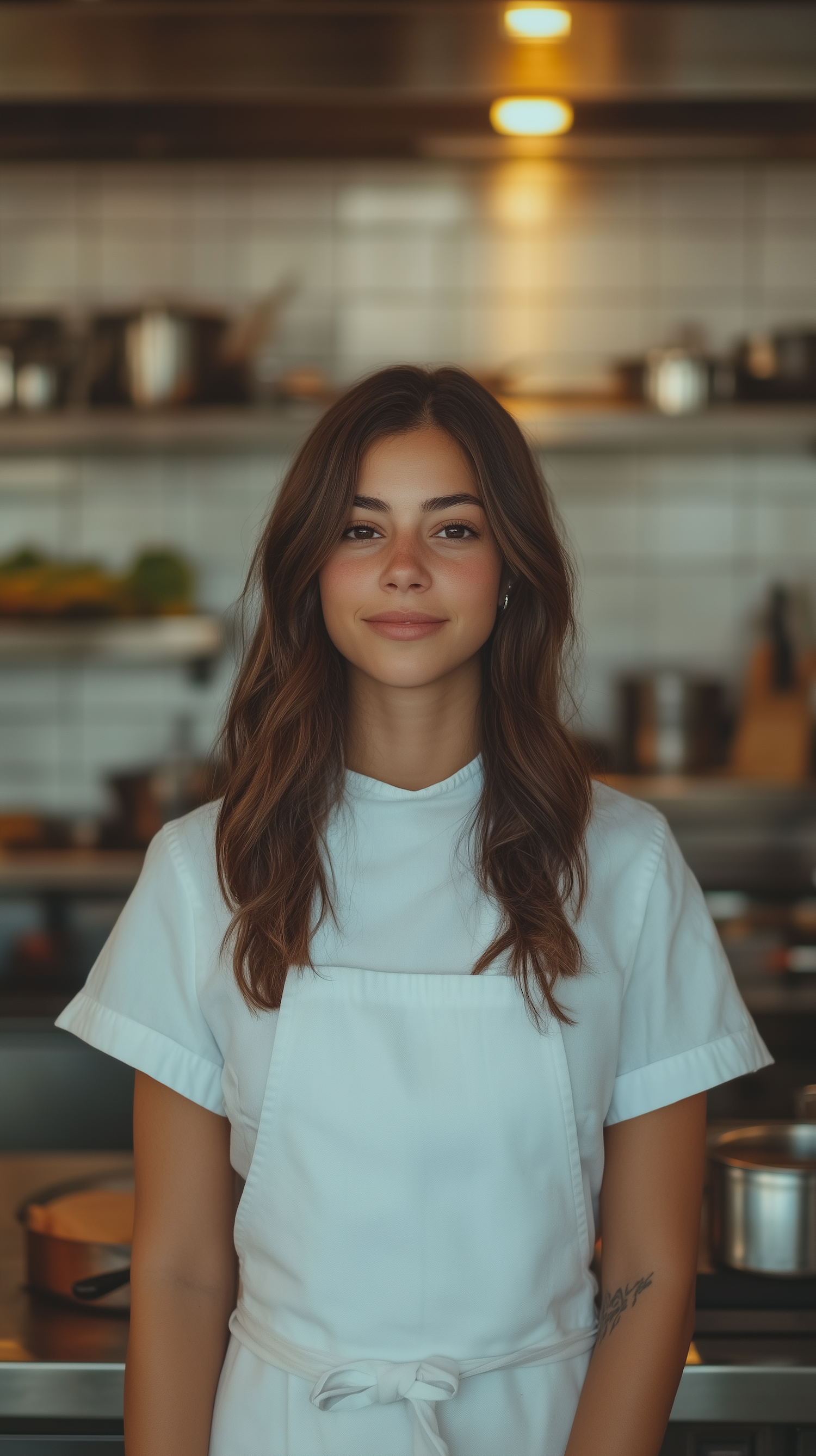 A female chef with wavy brown hair and a tattoo stands in a professional kitchen, wearing a white uniform. Face blurred for privacy.