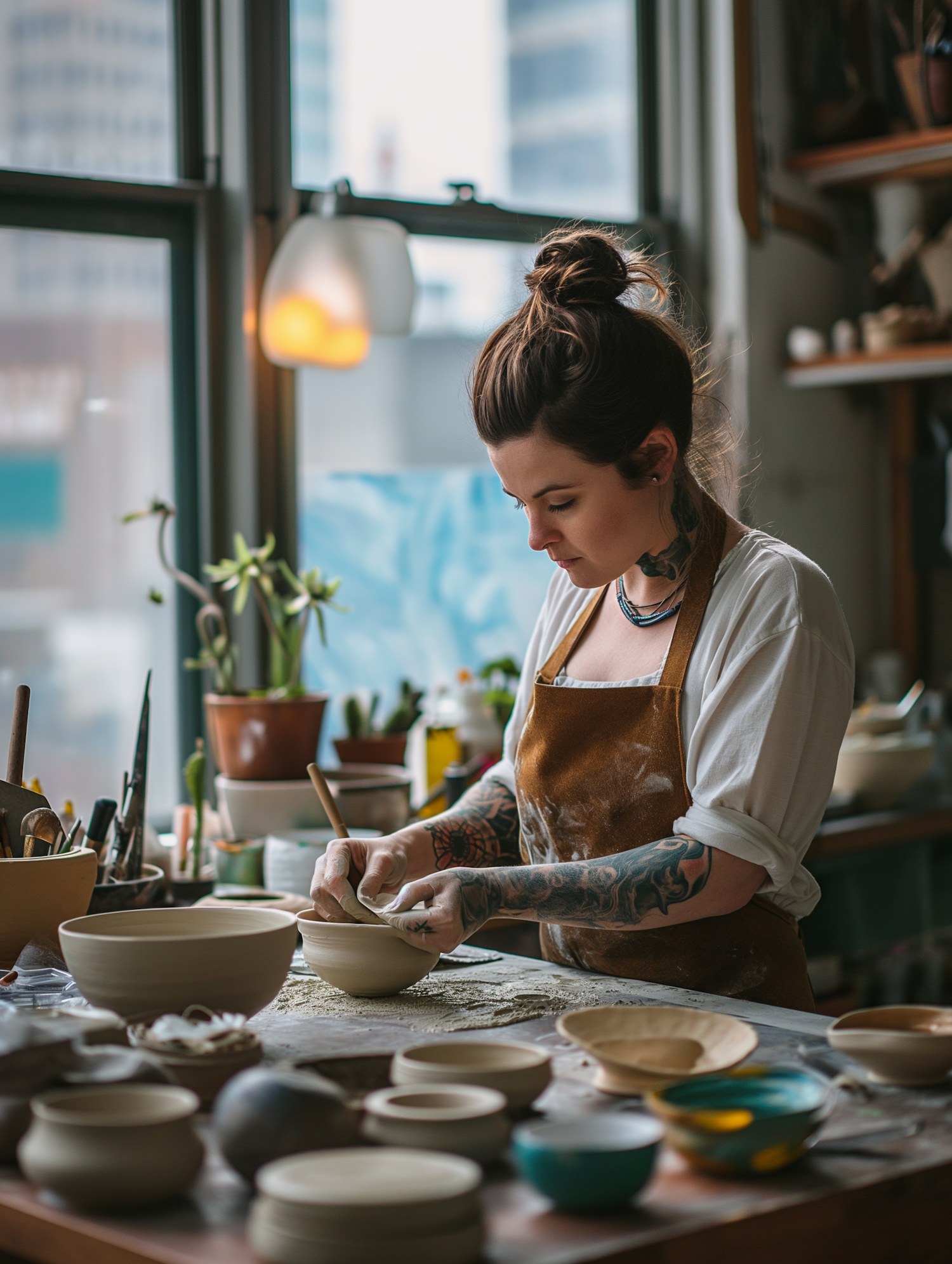 A tattooed woman crafts pottery in a sunlit studio, surrounded by clay bowls and tools, with city views through large windows.