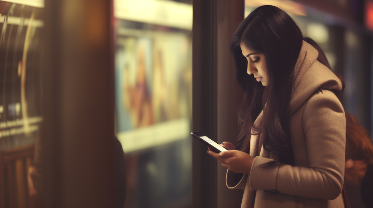 Young woman in a beige coat using her smartphone in a warmly lit public space, with blurred colorful backgrounds.