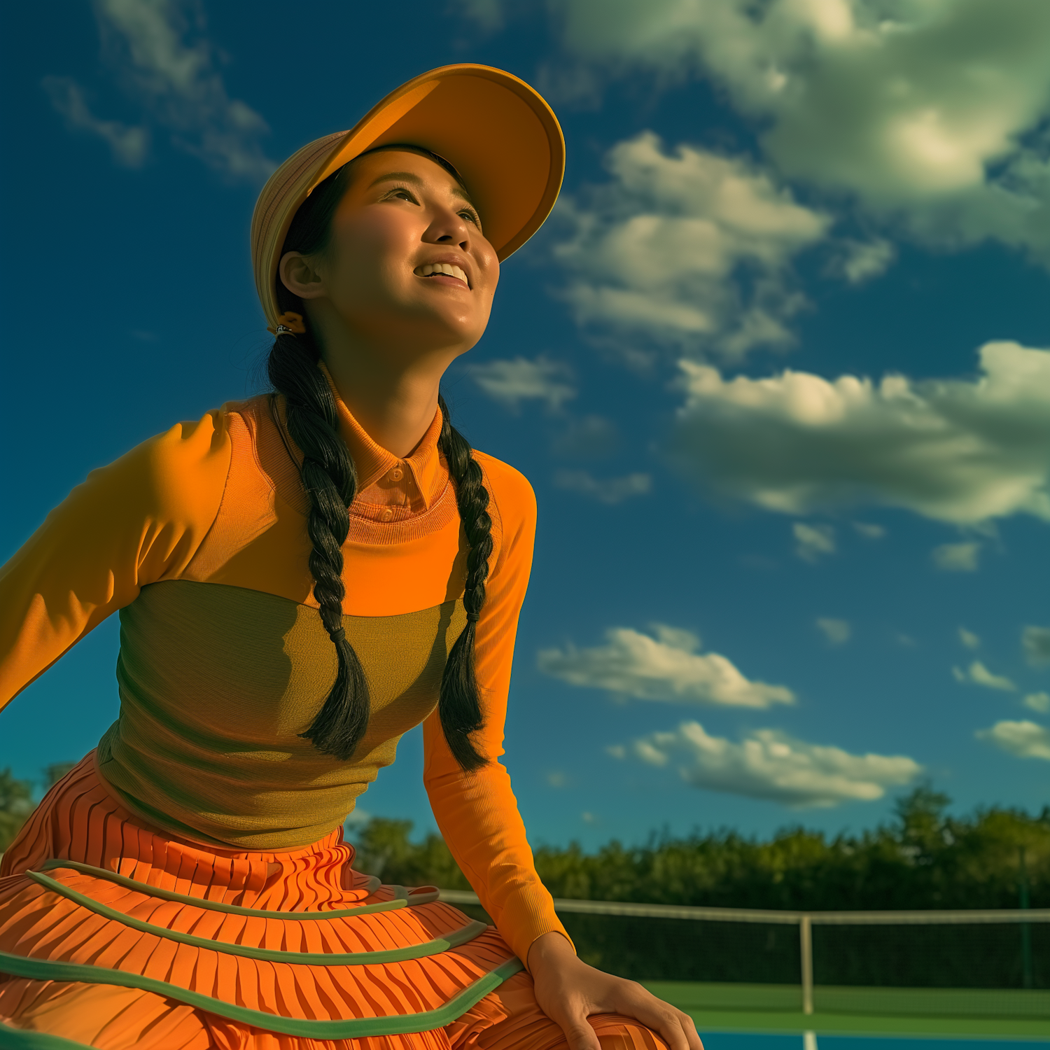 Asian woman in orange tennis attire with braided hair smiles under a vibrant sky on a tennis court, exuding joy and energy.