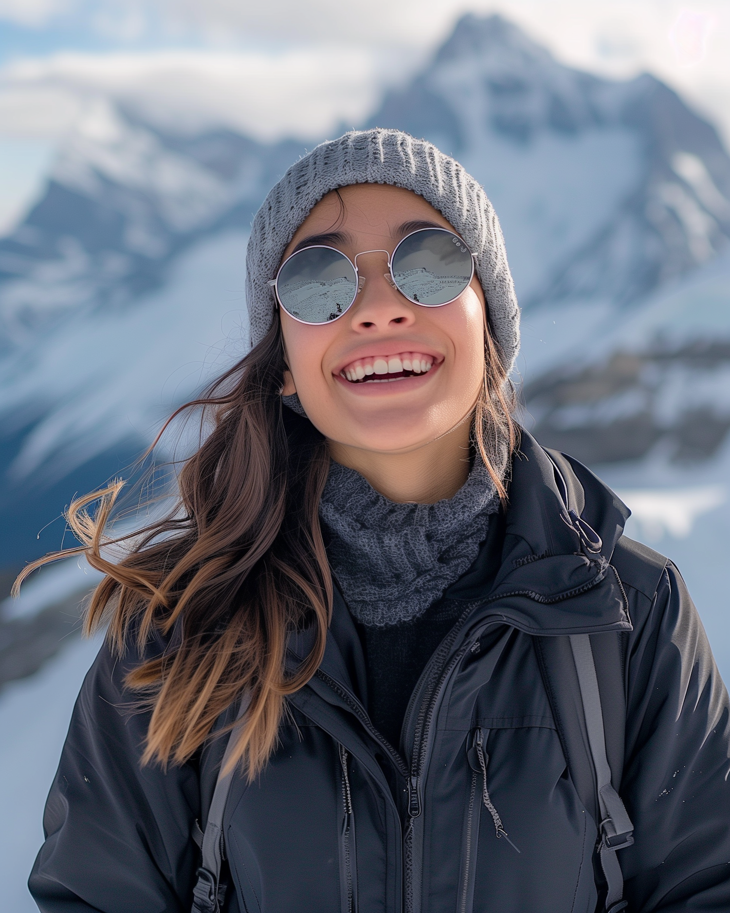 Smiling woman in winter gear with reflective sunglasses, set against a snowy mountain backdrop.