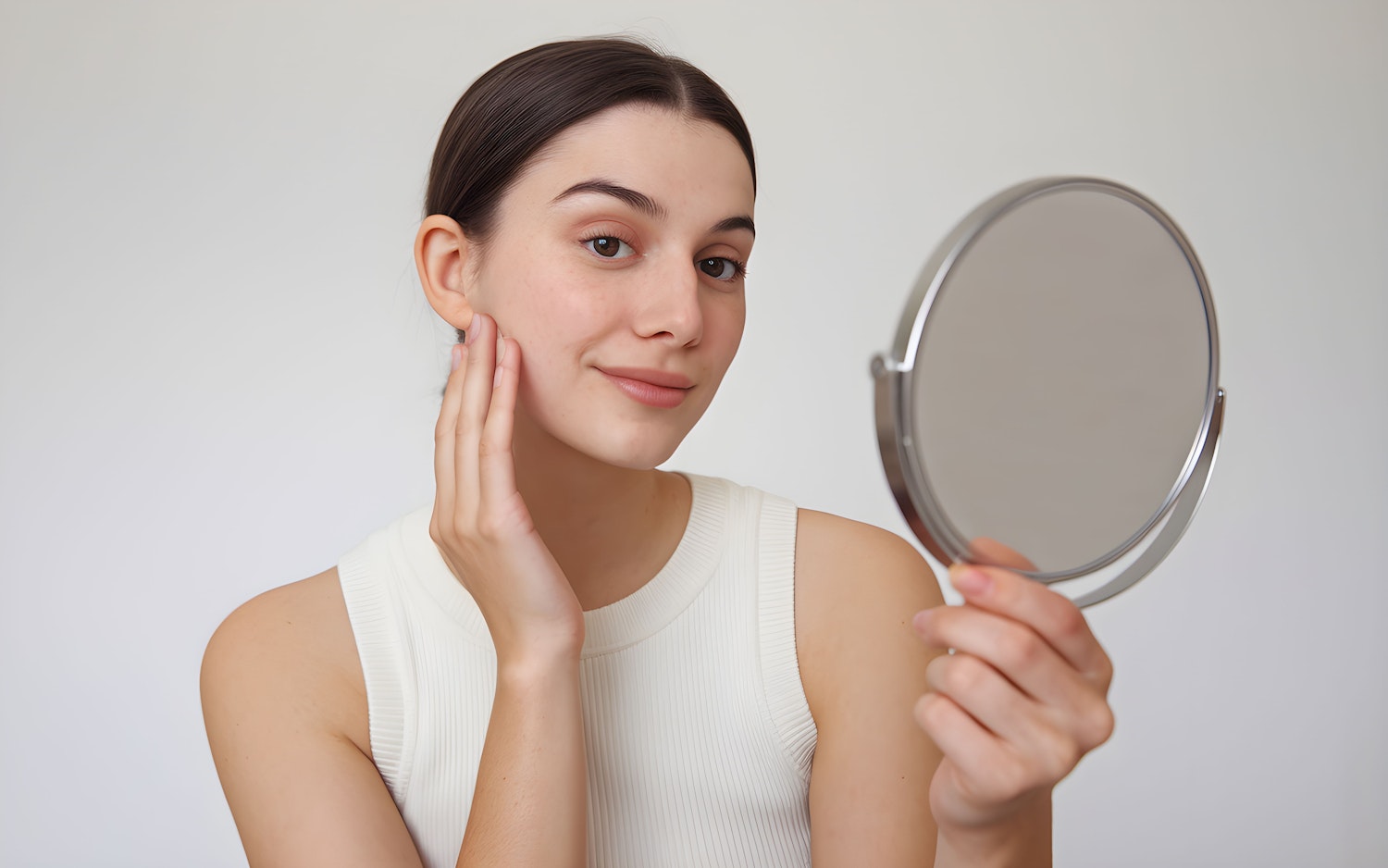 Young woman with dark hair holding a mirror, gently touching her cheek, wearing a white top against a light gray background.