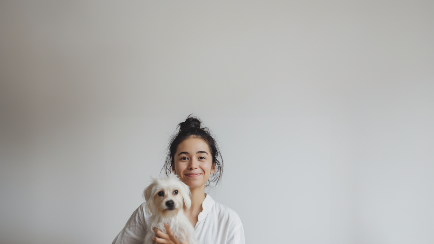Asian woman with dark hair holds a small white dog, both smiling against a plain background, creating a serene and minimalist scene.