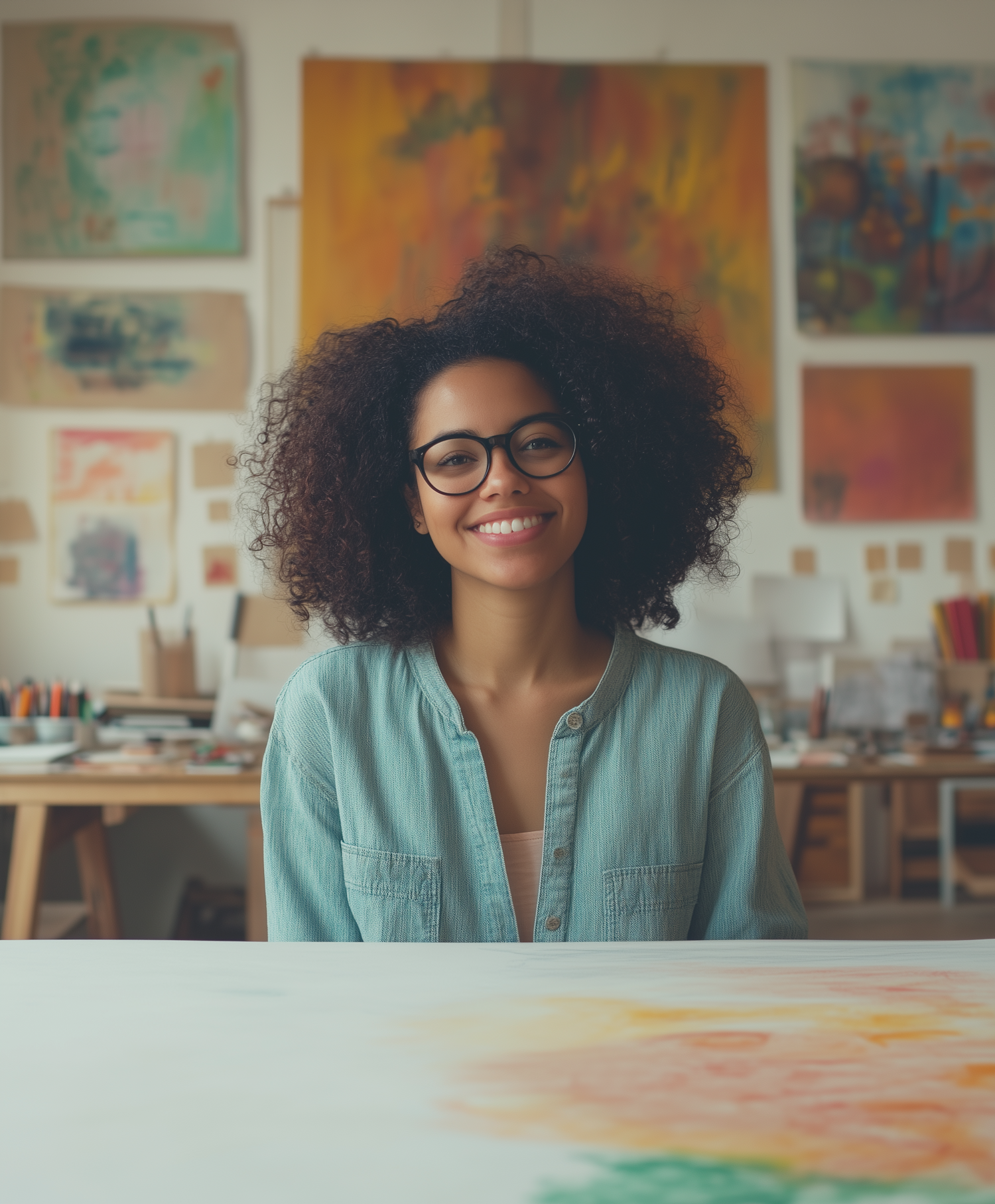 Smiling artist in a vibrant studio with colorful abstract paintings and art supplies.