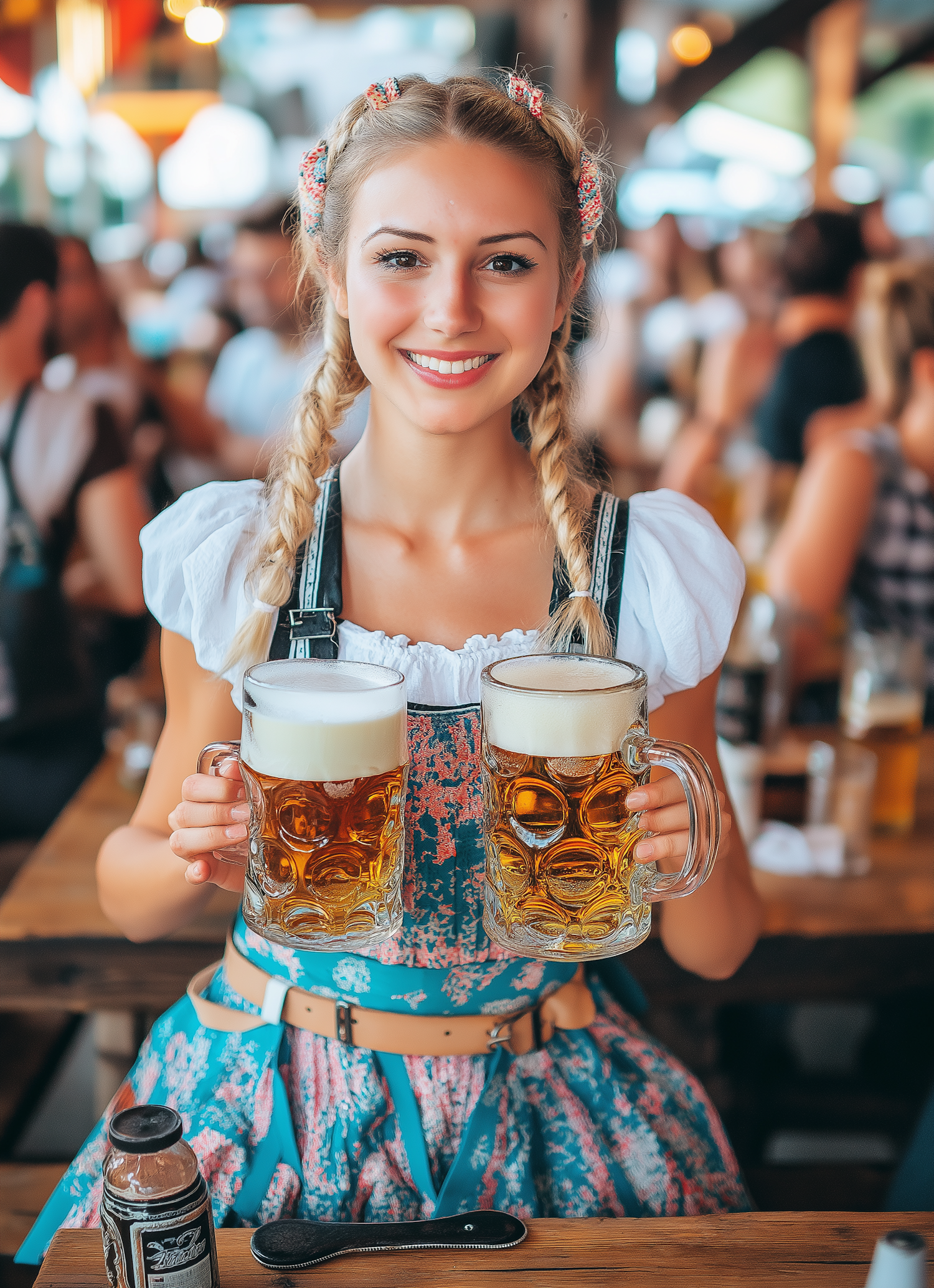 Smiling woman in traditional Bavarian dress holding two large beer mugs in a lively beer hall setting.