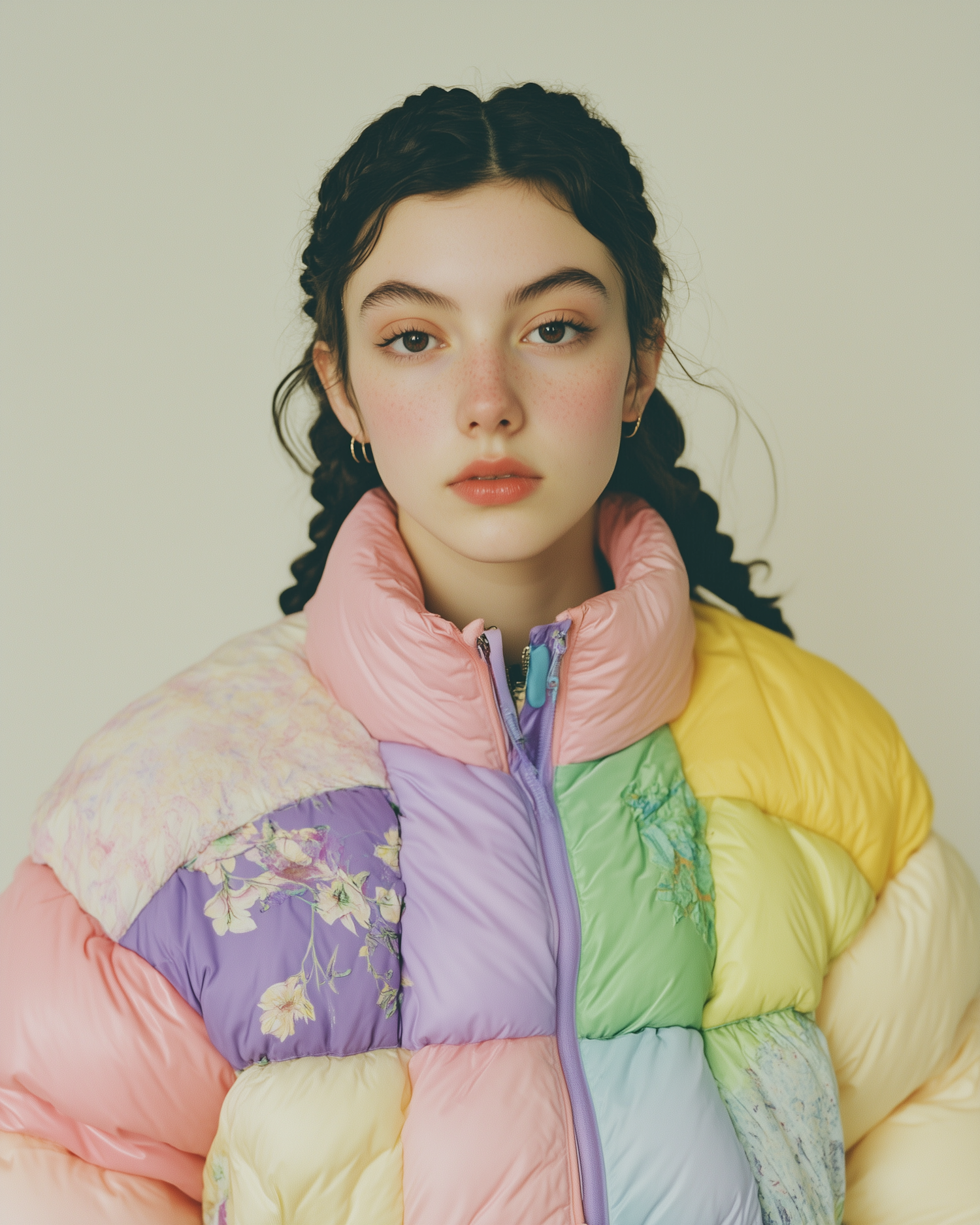 Young woman in a colorful pastel quilted jacket with floral patterns, dark braided hair, and a calm expression against a neutral background.