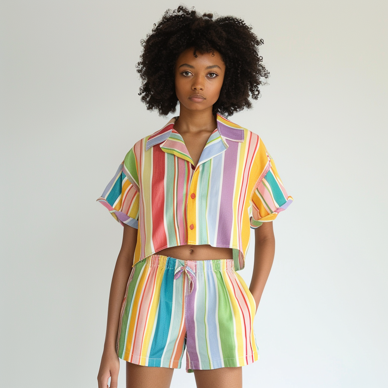 Young woman in vibrant striped outfit with curly hair, standing confidently against a plain background.