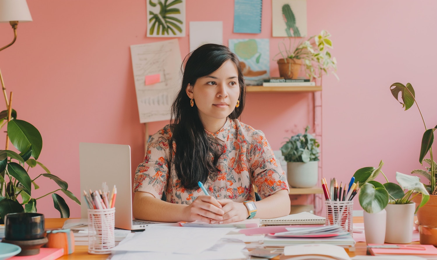 Asian woman in a floral blouse working at a creative desk with plants and art on a pink wall.