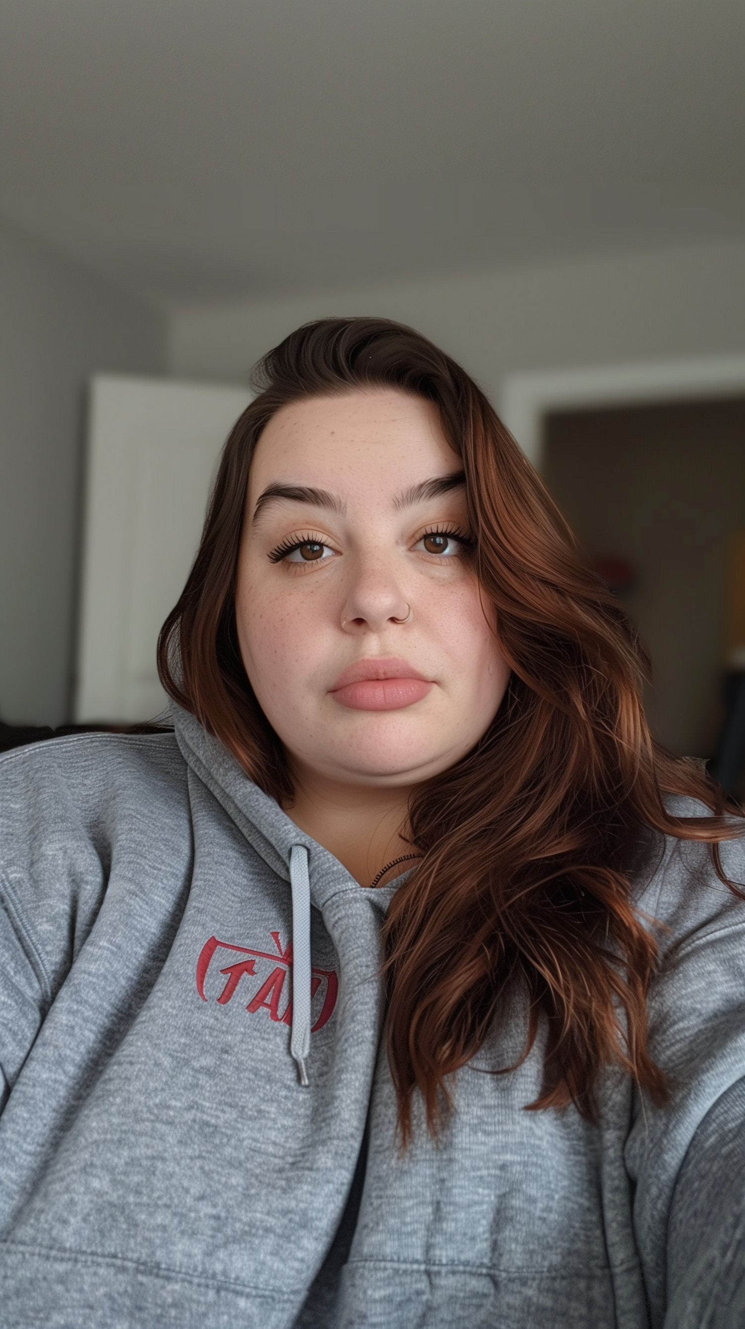 Young woman with brown hair and a gray hoodie, looking directly at the camera in a casual indoor setting.