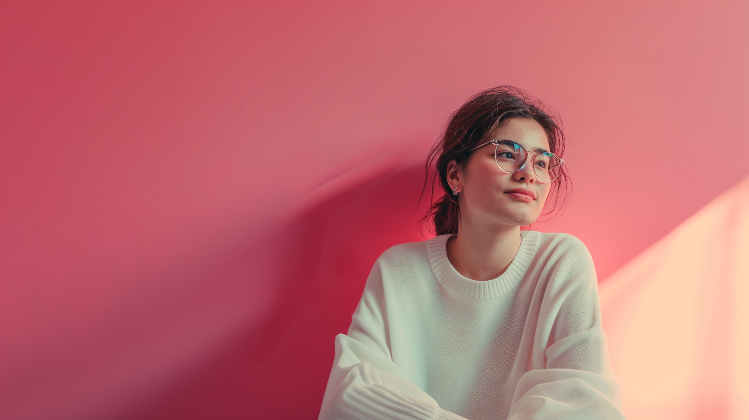 Young woman with glasses in a white sweater against a pink background, exuding a calm and thoughtful vibe.