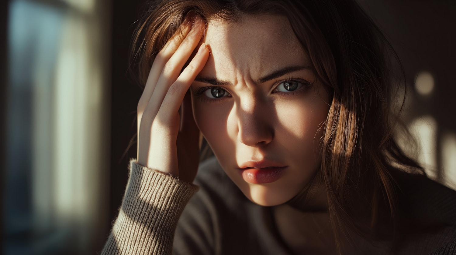 Close-up of a young woman with intense expression, blue eyes, and brown hair, bathed in natural light, wearing a beige sweater.
