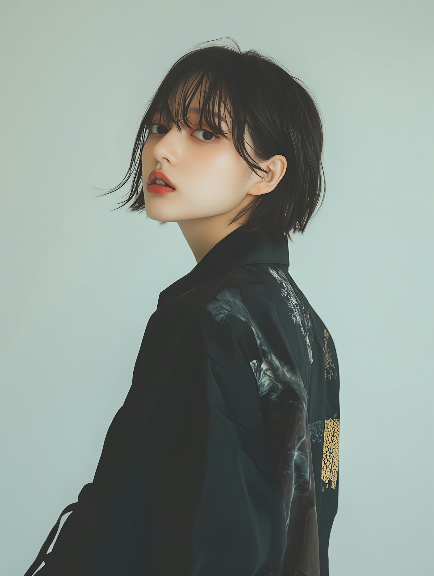 Elegant portrait of an Asian woman with short black hair, wearing a patterned black jacket against a muted green background.