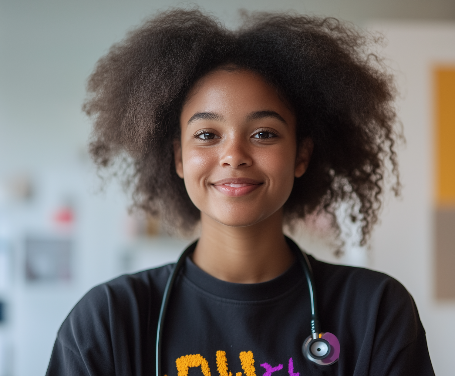 Young Black woman with curly hair and stethoscope, smiling warmly in a healthcare setting. Bright eyes and friendly expression.