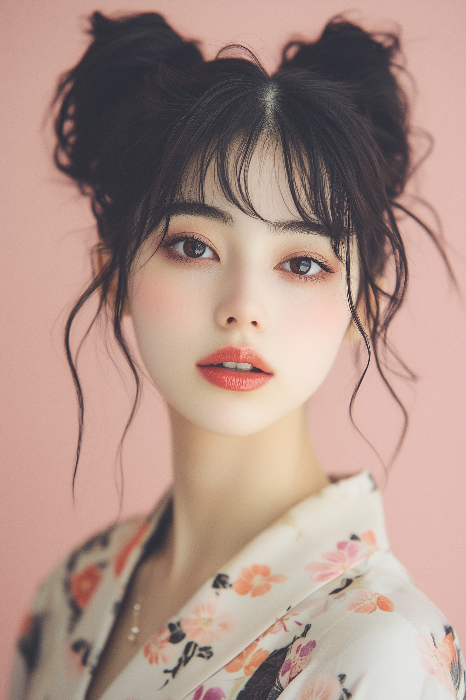 Elegant portrait of a young woman in a floral kimono, styled with soft makeup and loose buns, set against a pastel pink background.