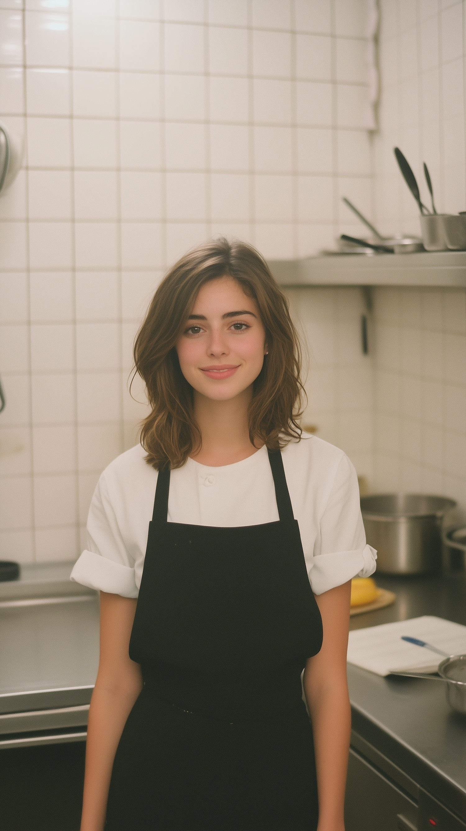 Young woman in a professional kitchen, wearing a white shirt and black apron, smiling warmly. Clean, tiled background with kitchen utensils.