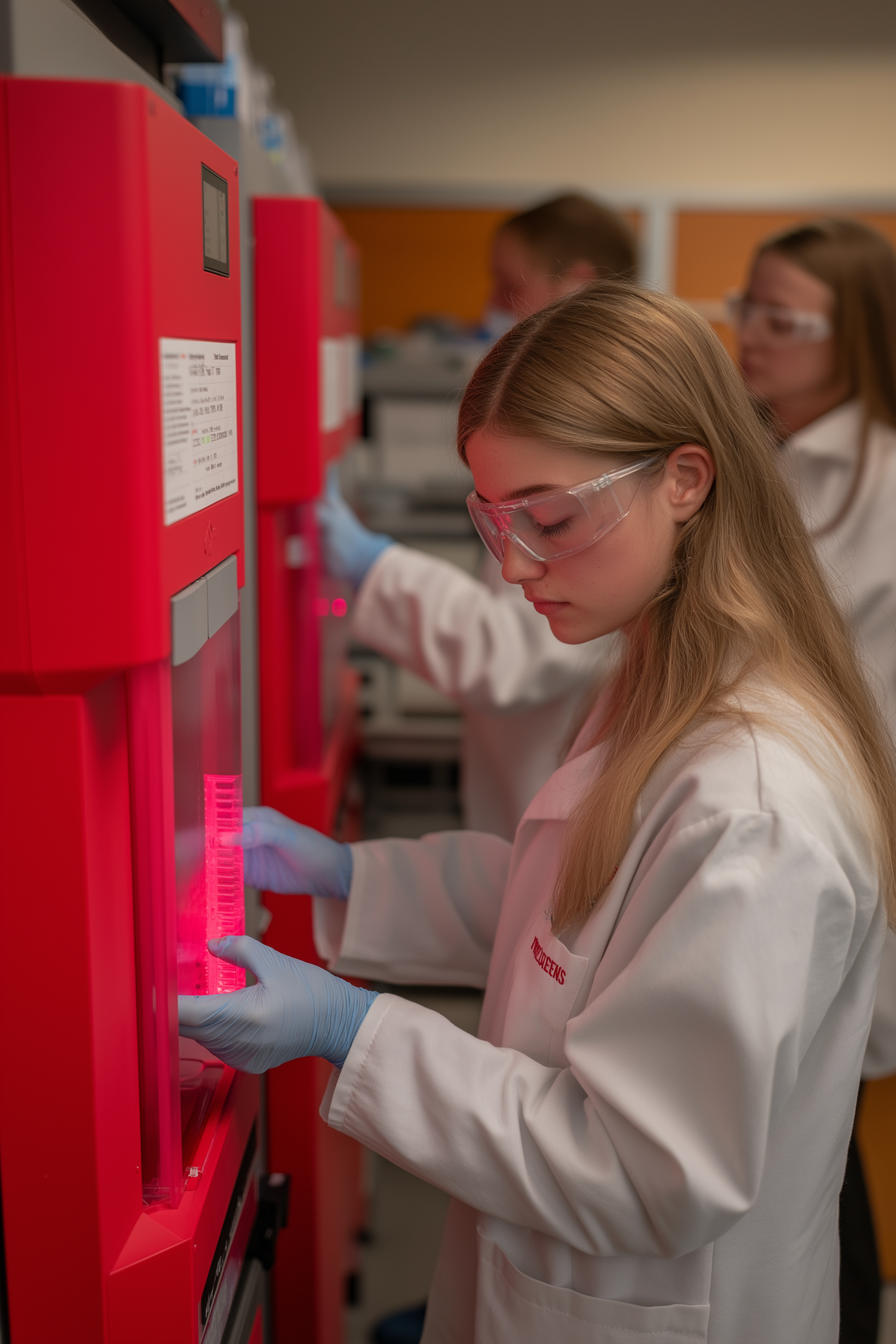 Young scientist in a lab coat working with red-lit equipment, wearing goggles and gloves, in a collaborative research environment.