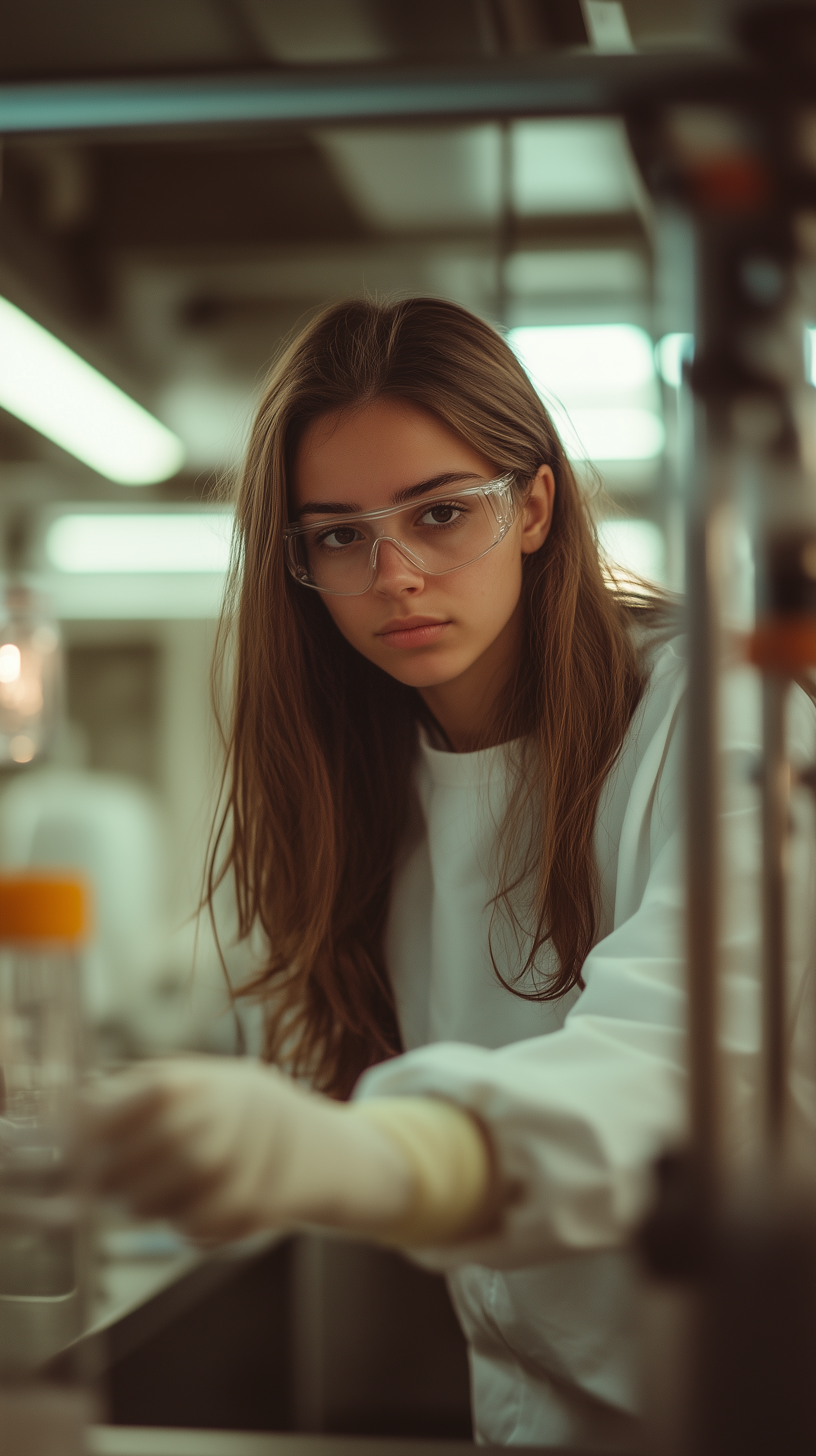 Young female scientist in a lab, wearing safety goggles and a lab coat, focused on her work with laboratory equipment.