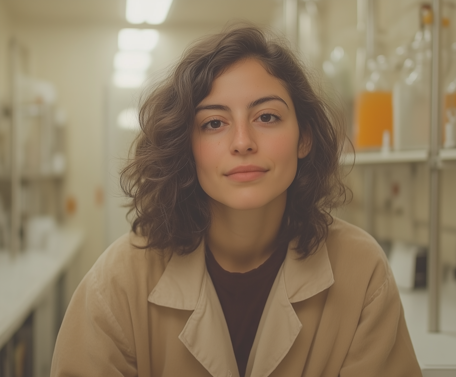 Young woman with curly brown hair in a lab coat, seated in a laboratory with blurred equipment in the background.