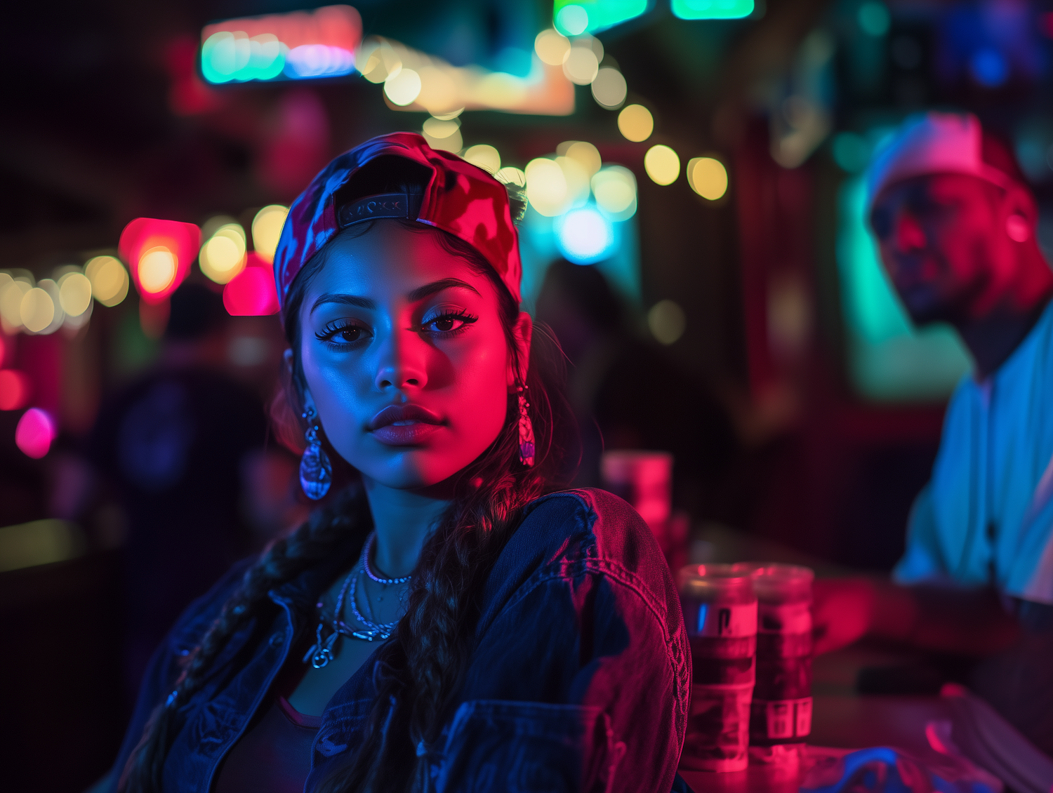 Stylish woman in neon-lit bar, wearing a denim jacket and cap, with vibrant pink and blue lighting creating a dramatic atmosphere.