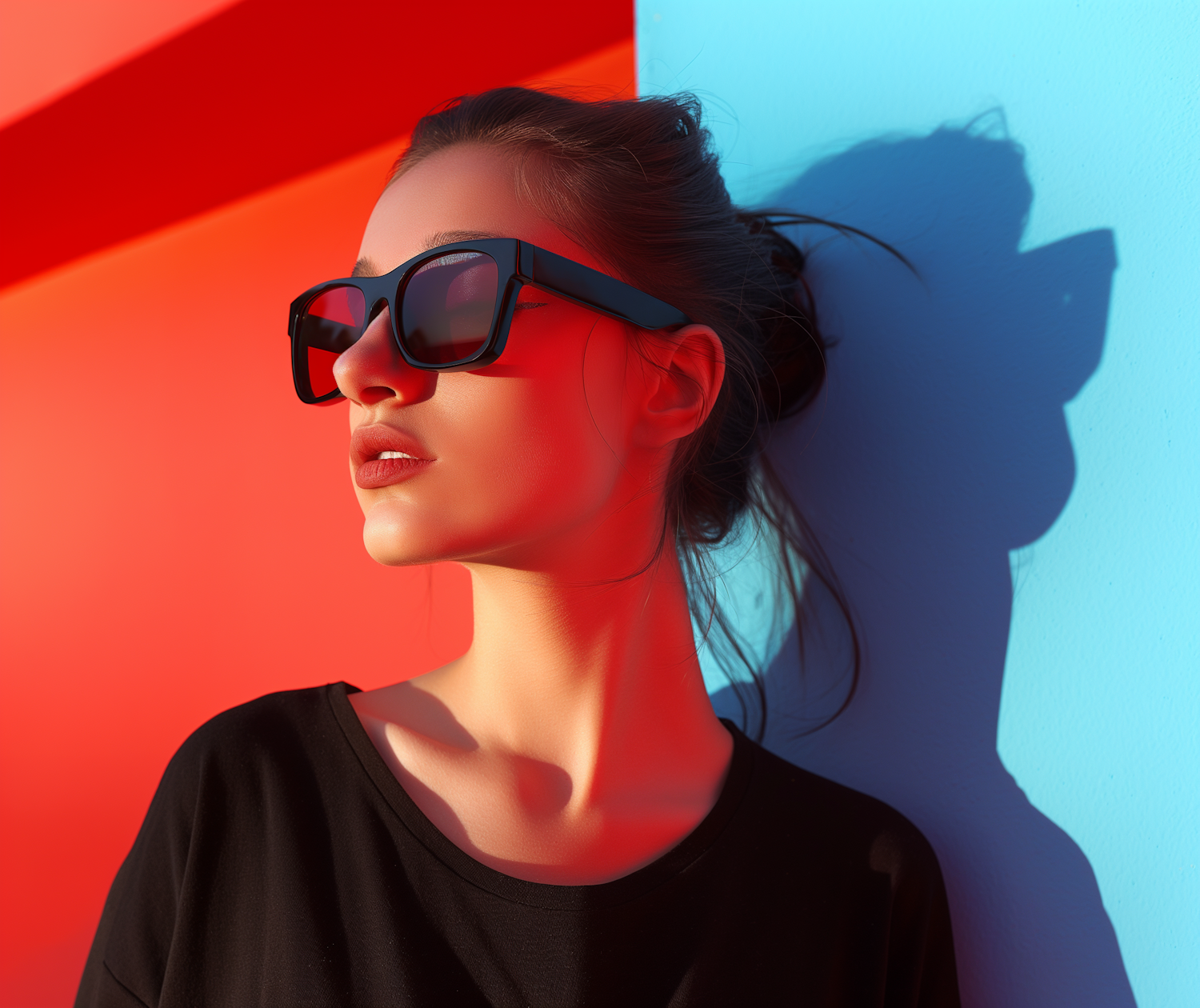 Stylish woman in sunglasses against a vibrant red and blue background, casting a dramatic shadow.