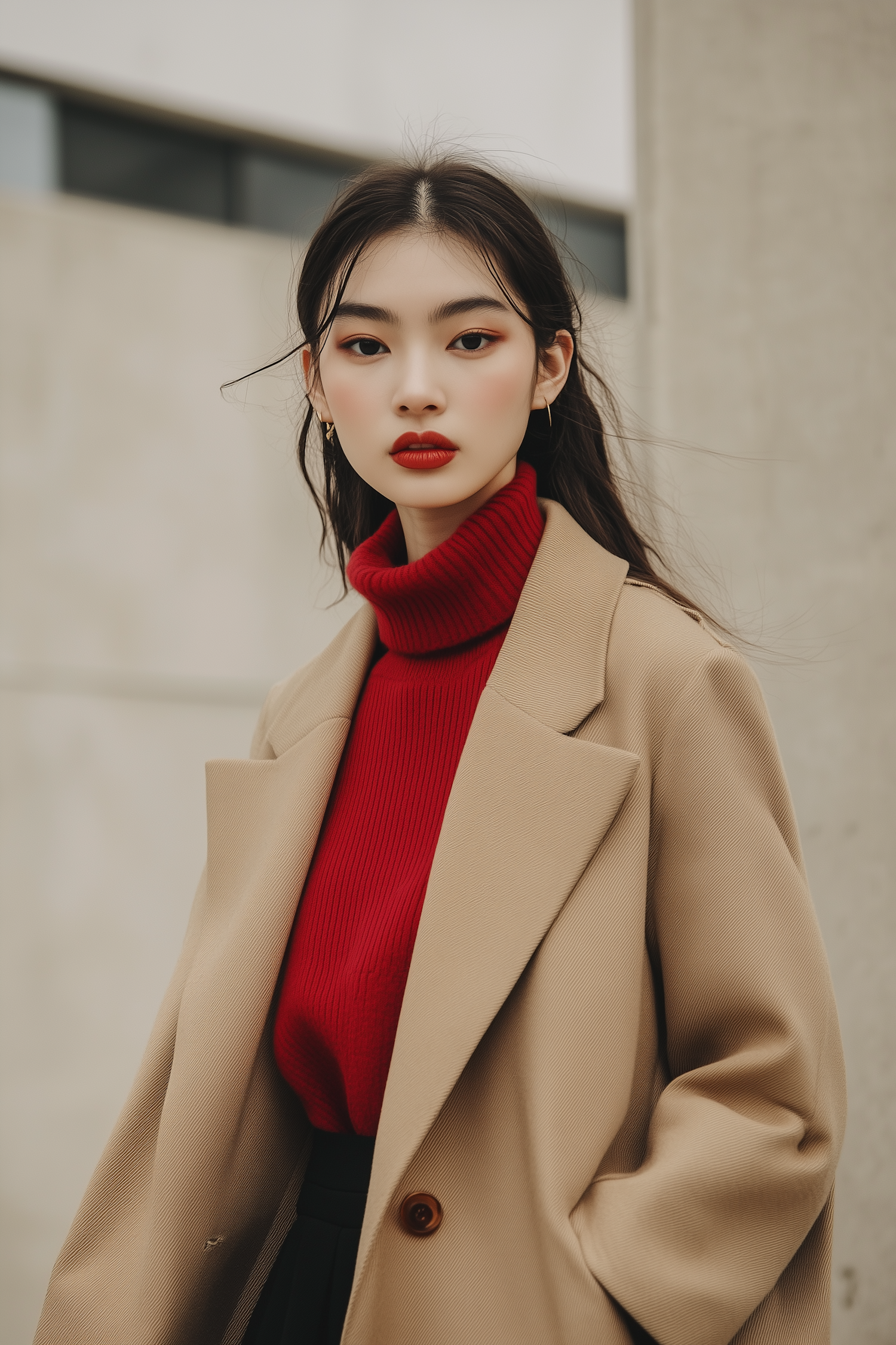 Stylish Asian woman in a red turtleneck and beige coat, exuding elegance in an urban setting. Bold red lipstick enhances her look.