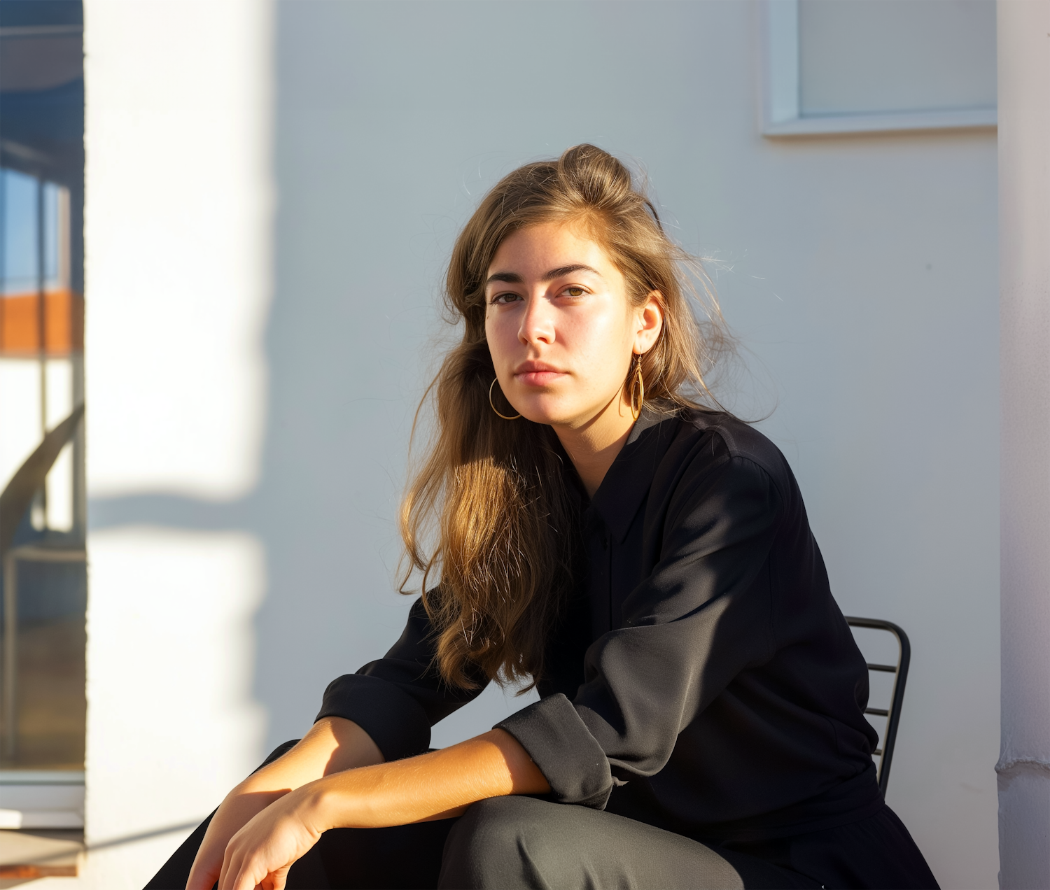 Young woman with long brown hair and hoop earrings sits in sunlight, wearing a black shirt. Calm expression against a minimalist background.