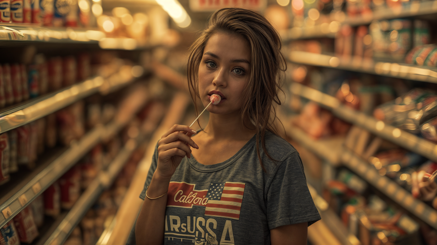 Young woman with a lollipop in a grocery aisle, wearing a California t-shirt. Warm lighting and blurred shelves create a cozy atmosphere.