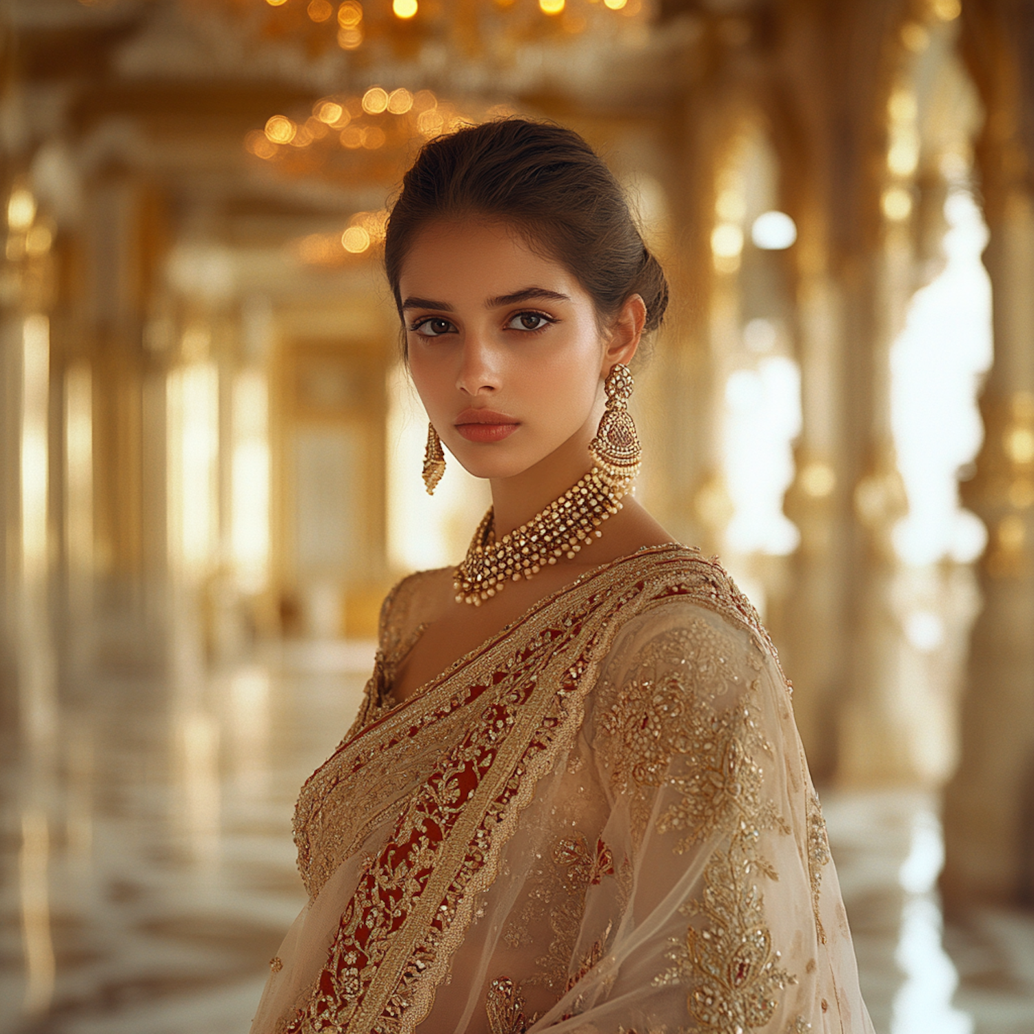 Elegant woman in a gold-embroidered saree with pearl jewelry in a luxurious palace setting, exuding grace and sophistication.