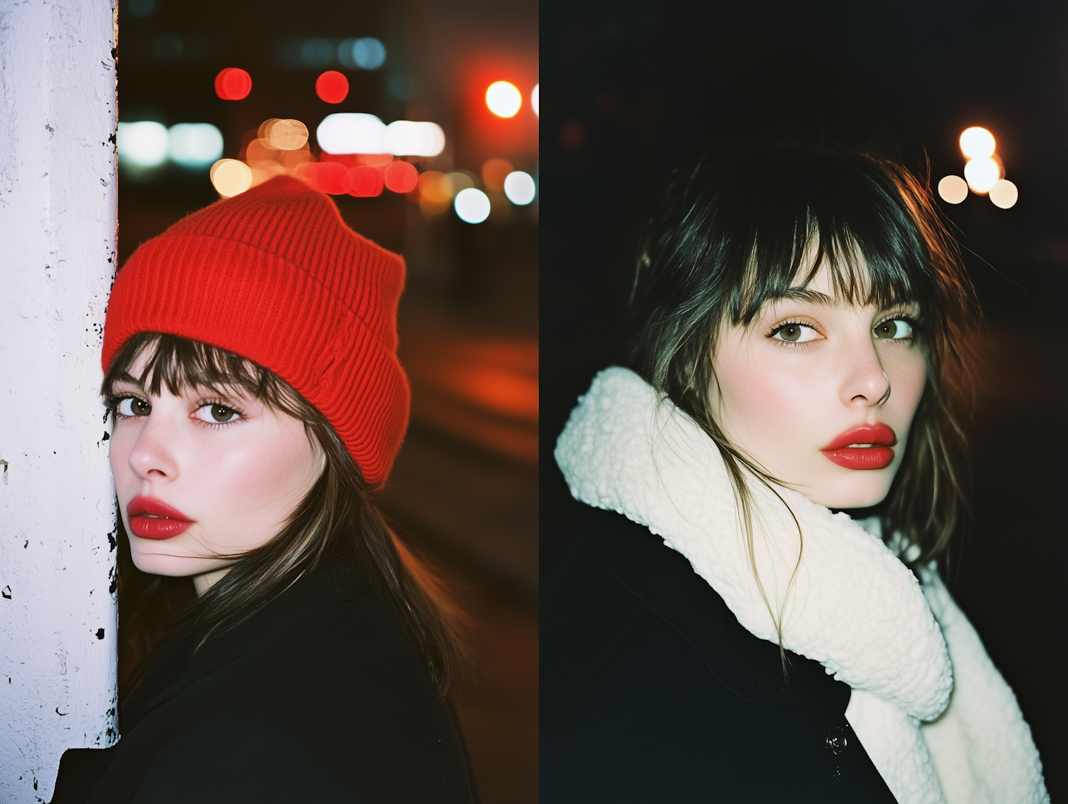 Split portrait of a woman in a red beanie and white scarf, set against a blurred urban night backdrop with bokeh lights.